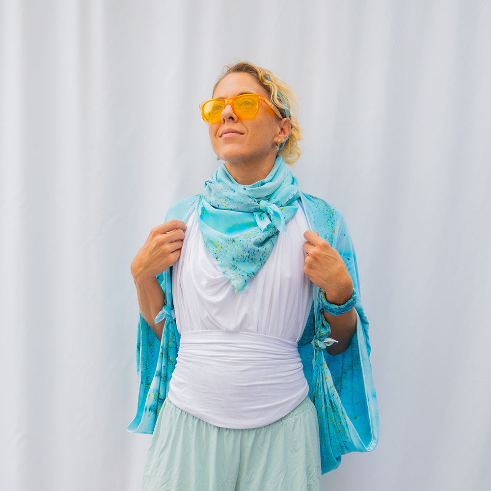 Wrap, knot, or drape the Parakeet Wild Rag around your neck, head, or shoulders — one square scarf that rewrites your outfit in seconds.