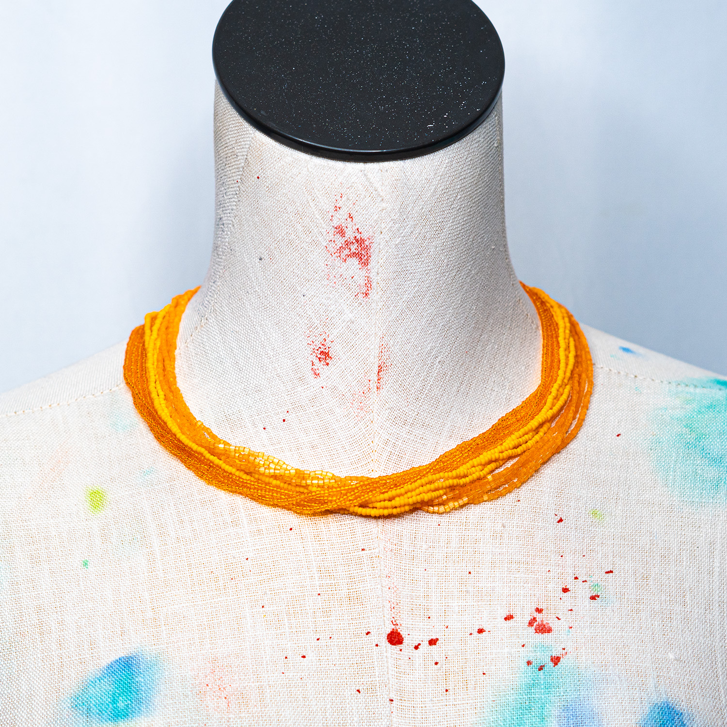 The Peach Necklace is 18 inches long and built from 12 strands of traditional Czech Preciosa Ornela seed beads — some of the finest glass beads made, known for consistent size, shape, and depth of color. Three magnetic clasps make it easy to put on and take off, and the strand construction means it drapes with a satisfying weight and texture. Each necklace is assembled by hand. Care: store in a cool, dry place. Avoid moisture and direct sunlight. Clean with a dry cloth.