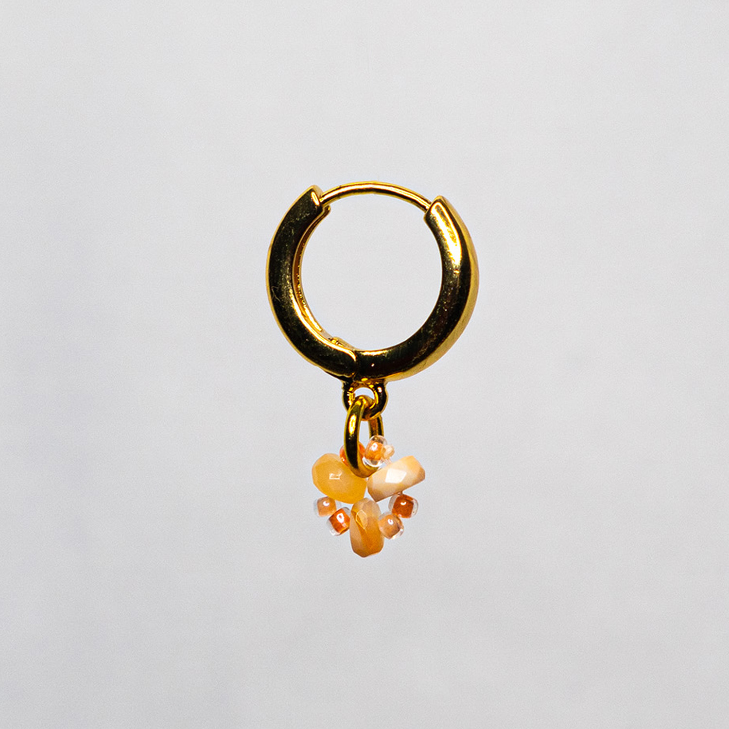 The Peach Opal Earrings pair Opal gemstones with Czech Preciosa Ornela beads on 18k gold huggie hoops — small enough to wear every day, interesting enough to earn a compliment.