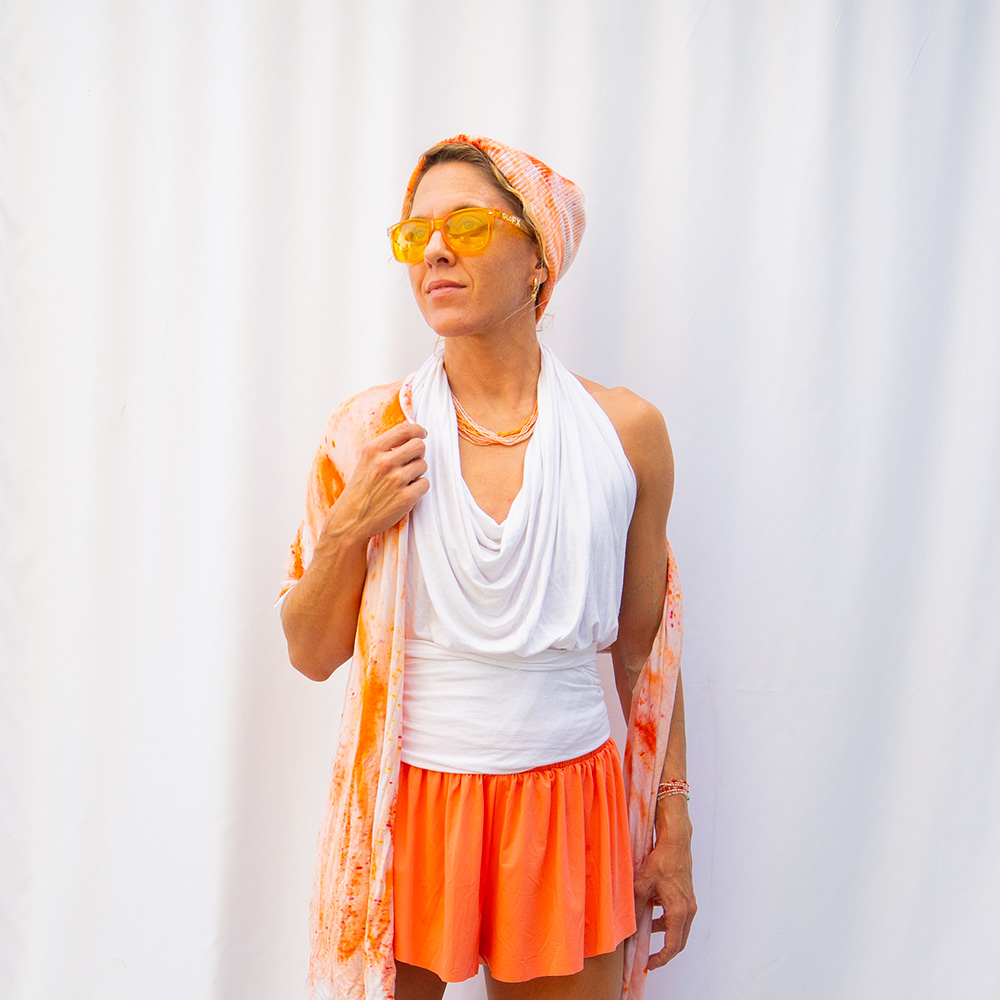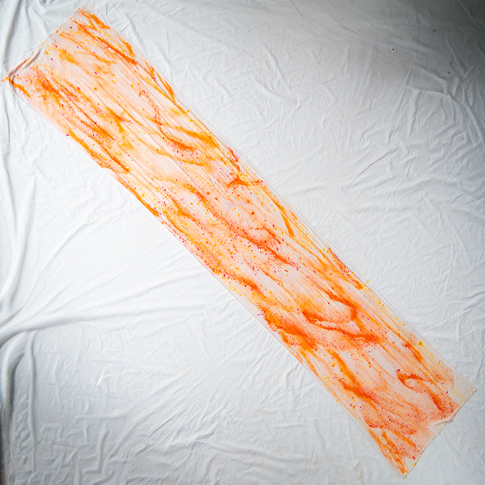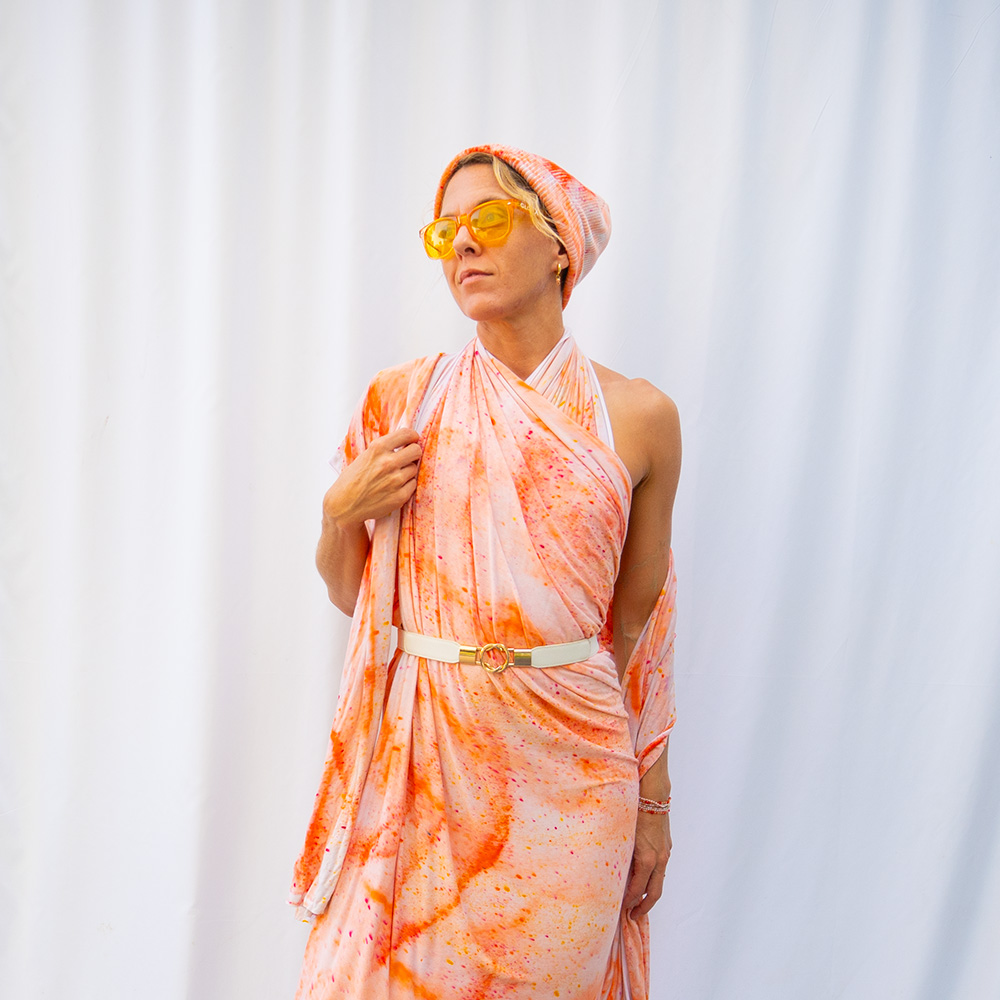 The Peach Knit Slim Wrap is a 20×72 inch rectangle cut from Rayon + Spandex knit with clean-finished edges. The knit has a soft give that makes it easy to tie without bulk. Each piece is hand dash-dyed using Dharma Procion MX fiber reactive dye — applied in intentional dashes so color saturates the fiber permanently. Care: machine wash cold, gentle cycle. Hang to dry. Do not iron.