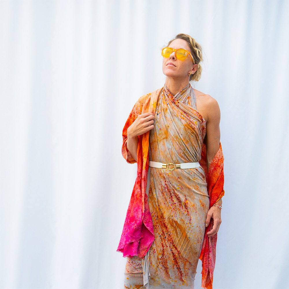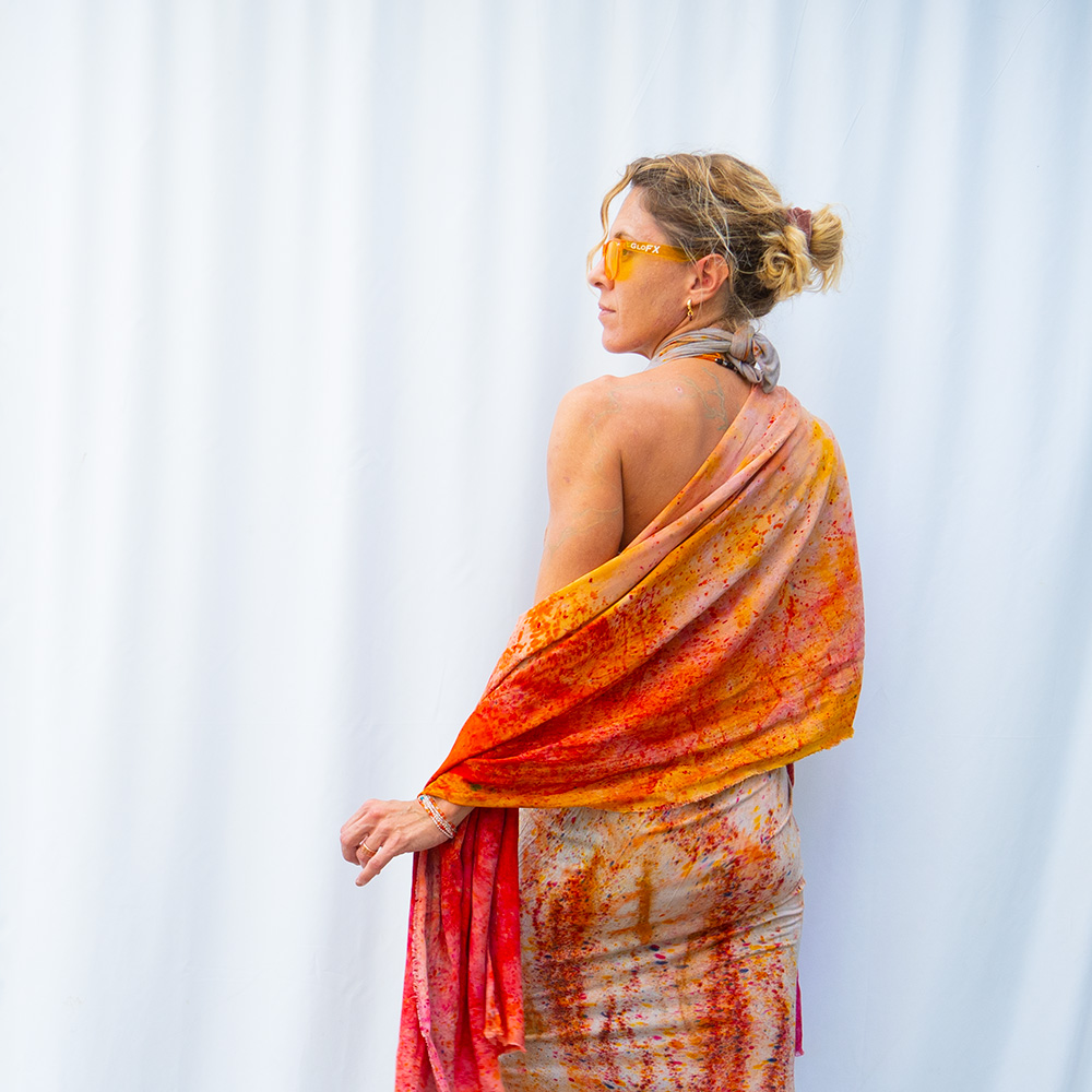 The Pink Fire Slim Wrap is a 20×72 inch rectangle cut from 100% Rayon with eyelash fringe. The woven rayon has a silky drape and a slight sheen that catches light as you move. Each piece is hand dash-dyed using Dharma Procion MX fiber reactive dye — applied in intentional dashes so color saturates the fiber permanently. Care: machine wash cold, gentle cycle. Hang to dry. Iron on low heat.