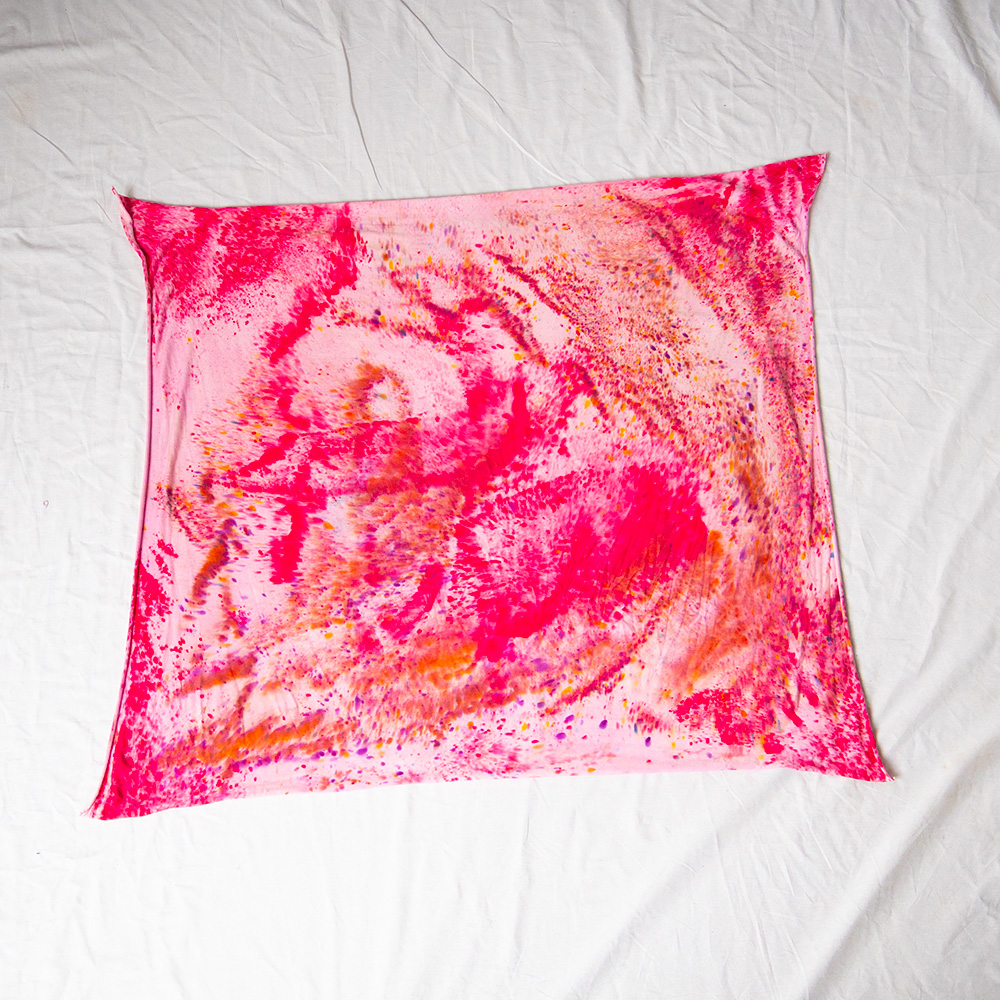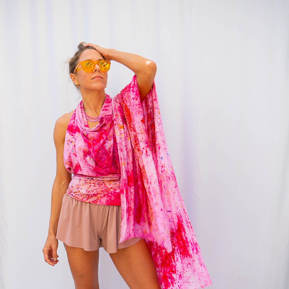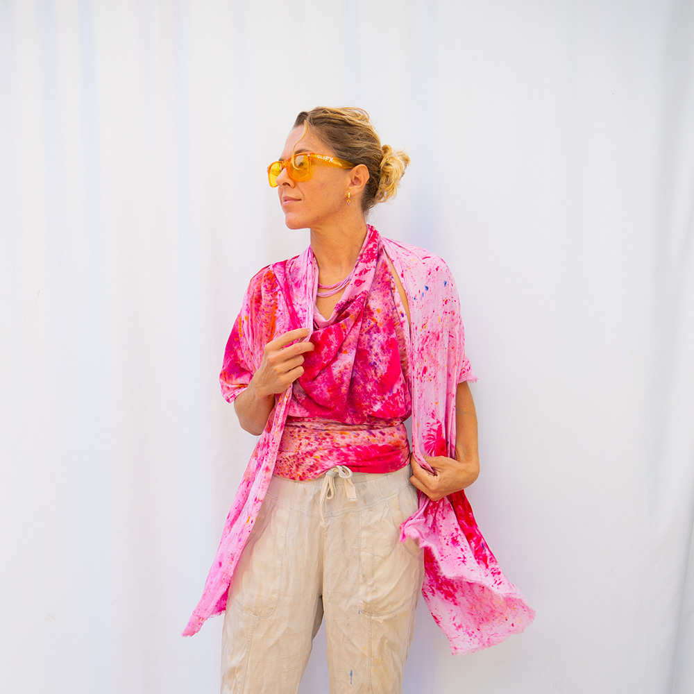 The Pink Wild Rag is a 36×36 inch square scarf cut from Rayon Knit. Rayon drapes with a fluid, silk-like weight that holds a knot beautifully and moves with you all day. Each piece is hand dash-dyed using Dharma Procion MX fiber reactive dye — a powder pigment mixed with a fixative and applied in small, intentional dashes so the color sets permanently into the fiber. No two pieces are identical. Care: machine wash cold, gentle cycle. Hang or lay flat to dry. Do not iron.
