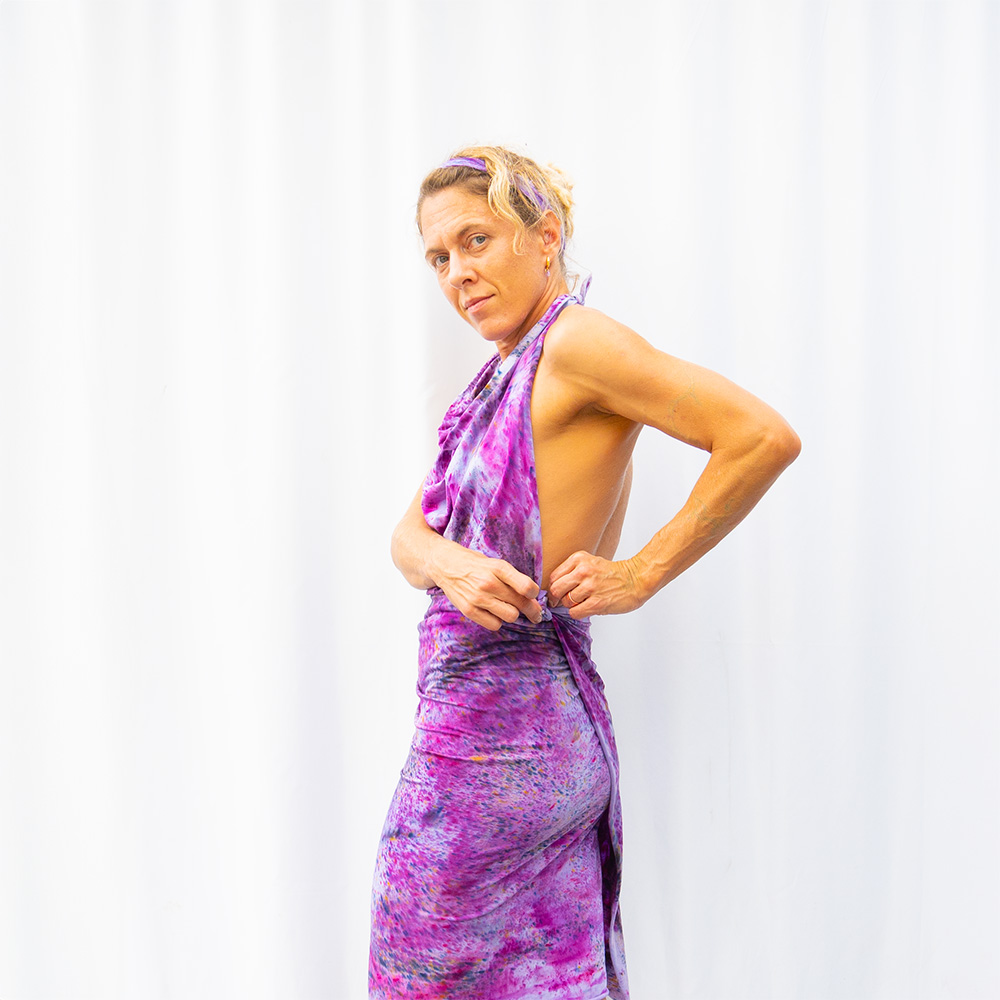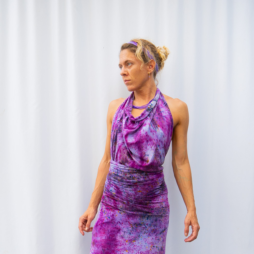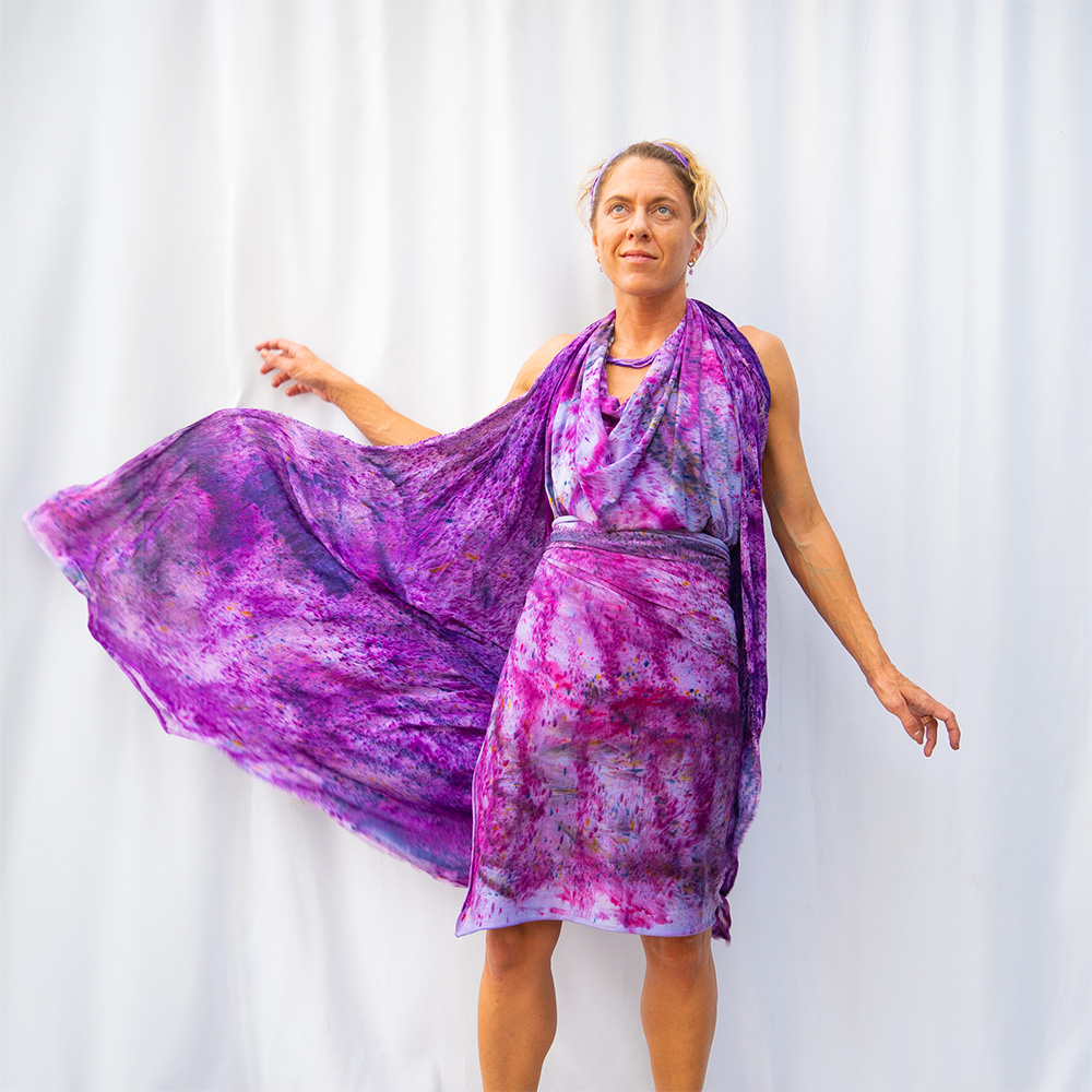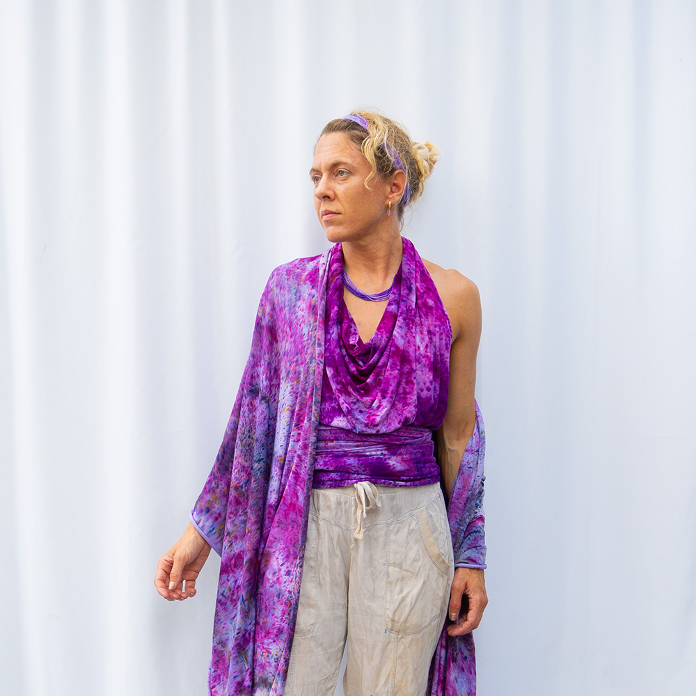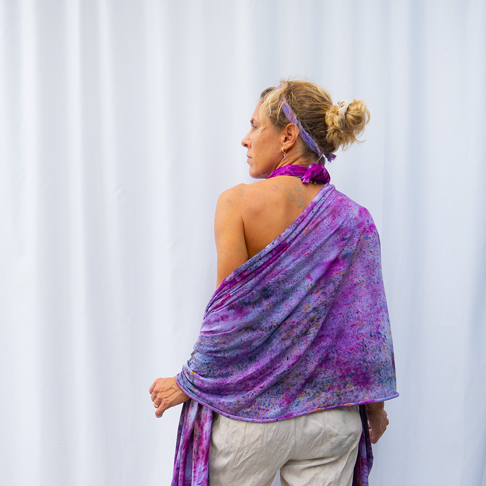 The Plum Flow Wrap is a 30×82 inches rectangle cut from ultra-soft Rayon + Spandex knit. The knit construction stretches gently with the body and rebounds without sagging, making it wearable as a shawl, an open cardigan, or an oversized wrap. Each piece is hand dash-dyed using Dharma Procion MX fiber reactive dye — a reactive powder pigment that bonds permanently to the fiber rather than sitting on top. Color depth varies subtly across each piece, making every one unique. Care: machine wash cold, gentle cycle. Lay flat to dry. Do not iron.