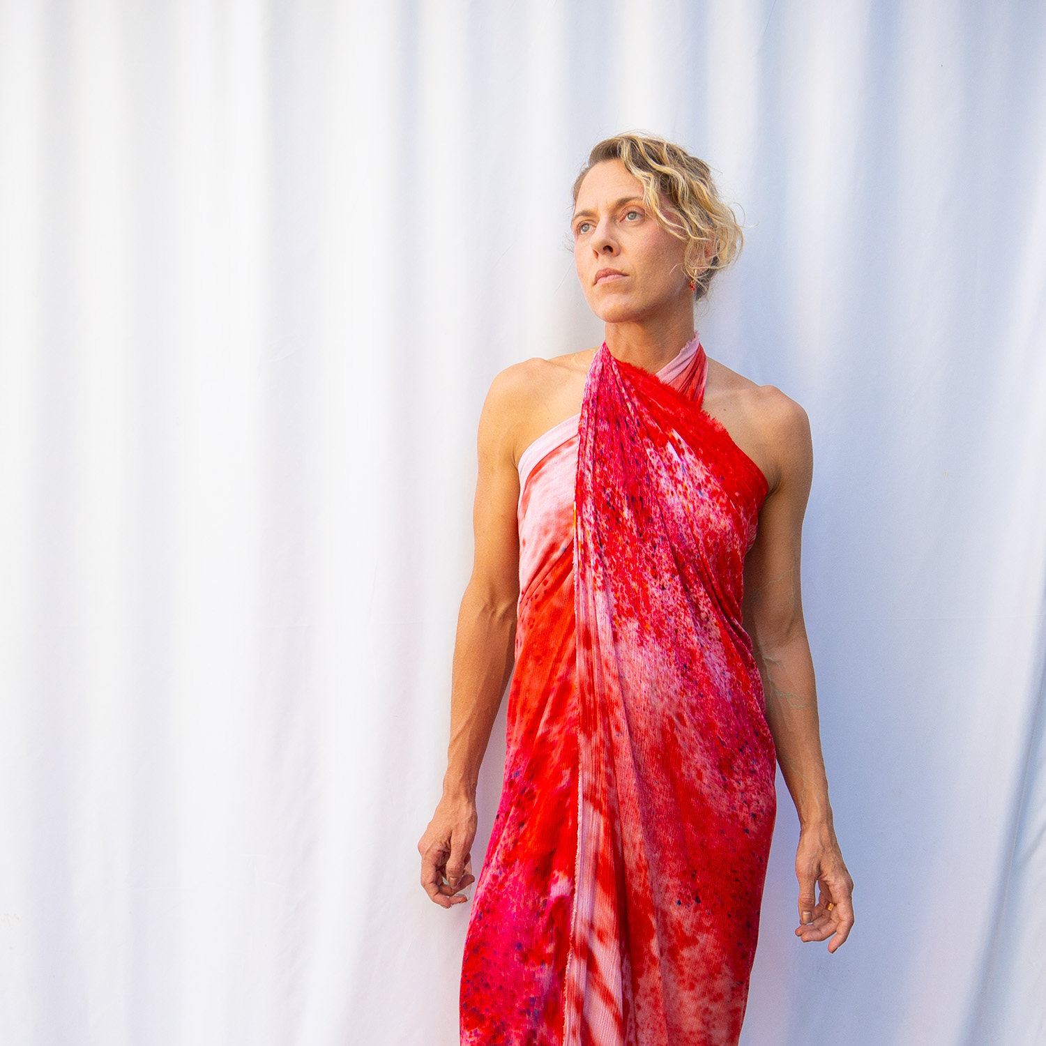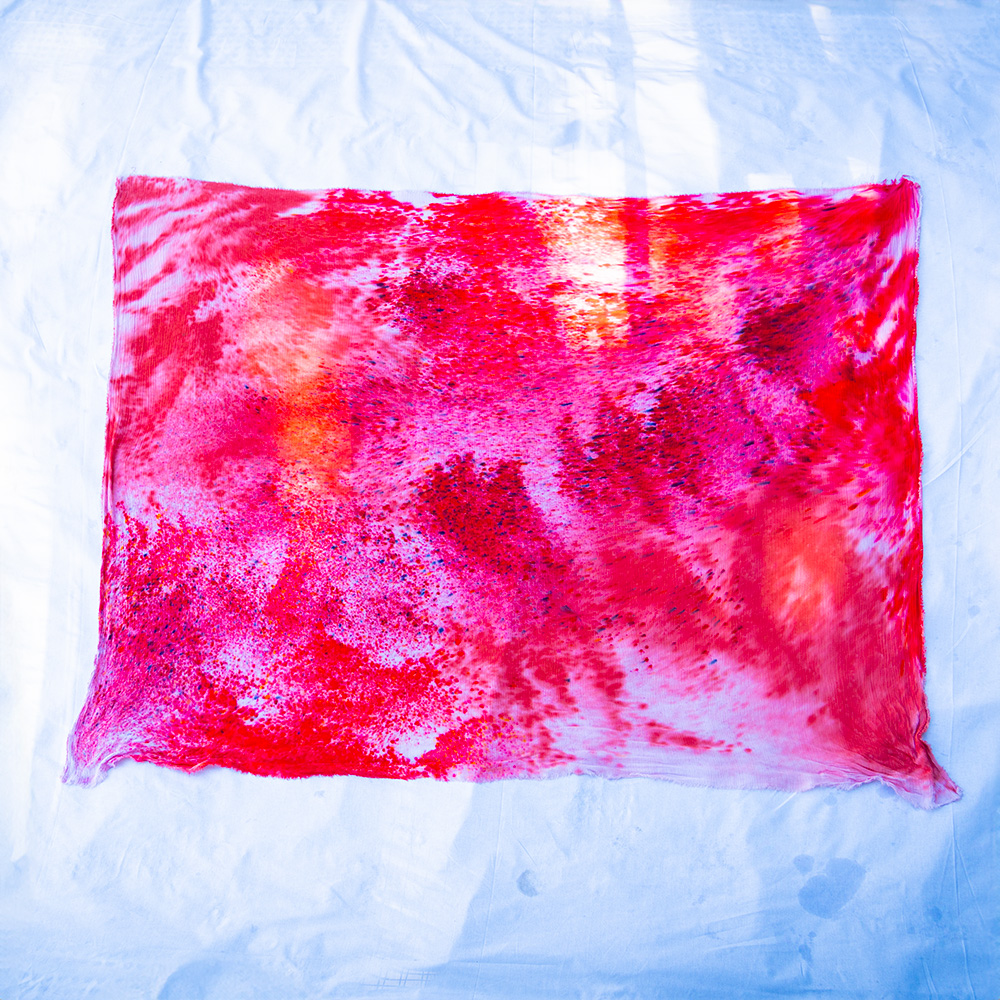 The Pomegranate Square Wrap is a 50×50 inch square cut from 100% rayon. The generous size gives you full coverage as a wrap or shawl, and the lightweight rayon means it packs into nothing and emerges wrinkle-free. Each piece is hand dash-dyed using Dharma Procion MX fiber reactive dye — powder pigment fixed permanently into the fiber in small, deliberate dashes. The color is set, not coated, so it remains vivid through years of washing. Care: machine wash cold, regular cycle. Lay flat to dry. Do not iron.