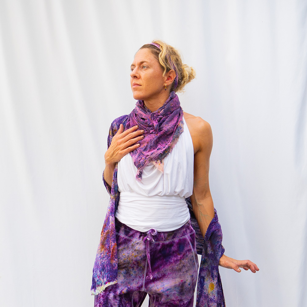 The Power Berry Slim Wrap is a 20×72 inch rectangle cut from 100% Rayon with eyelash fringe. The woven rayon has a silky drape and a slight sheen that catches light as you move. Each piece is hand dash-dyed using Dharma Procion MX fiber reactive dye — applied in intentional dashes so color saturates the fiber permanently. Care: machine wash cold, gentle cycle. Hang to dry. Iron on low heat.