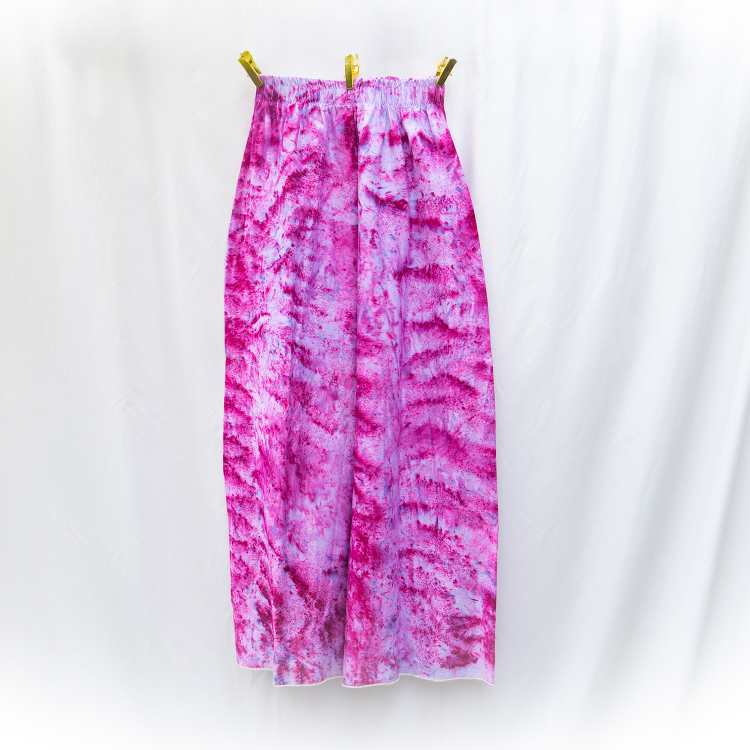 The Raspberry Denim Pants are cut from stretch denim — 70% cotton, 28% polyester, 2% spandex — with a 32-inch waist (stretch fit) and 34-inch inseam. The elastic waistband sits flat and stays put, and the fabric has enough recovery to layer easily over leggings or yoga pants. Each pair is hand dash-dyed using Dharma Procion MX fiber reactive dye — applied in small, deliberate amounts so the pigment bonds permanently to the cotton fibers. The color is in the fiber, not on it, so it holds up through repeated washing without fading. Care: machine wash cold. Tumble dry low. Do not iron the dyed areas.