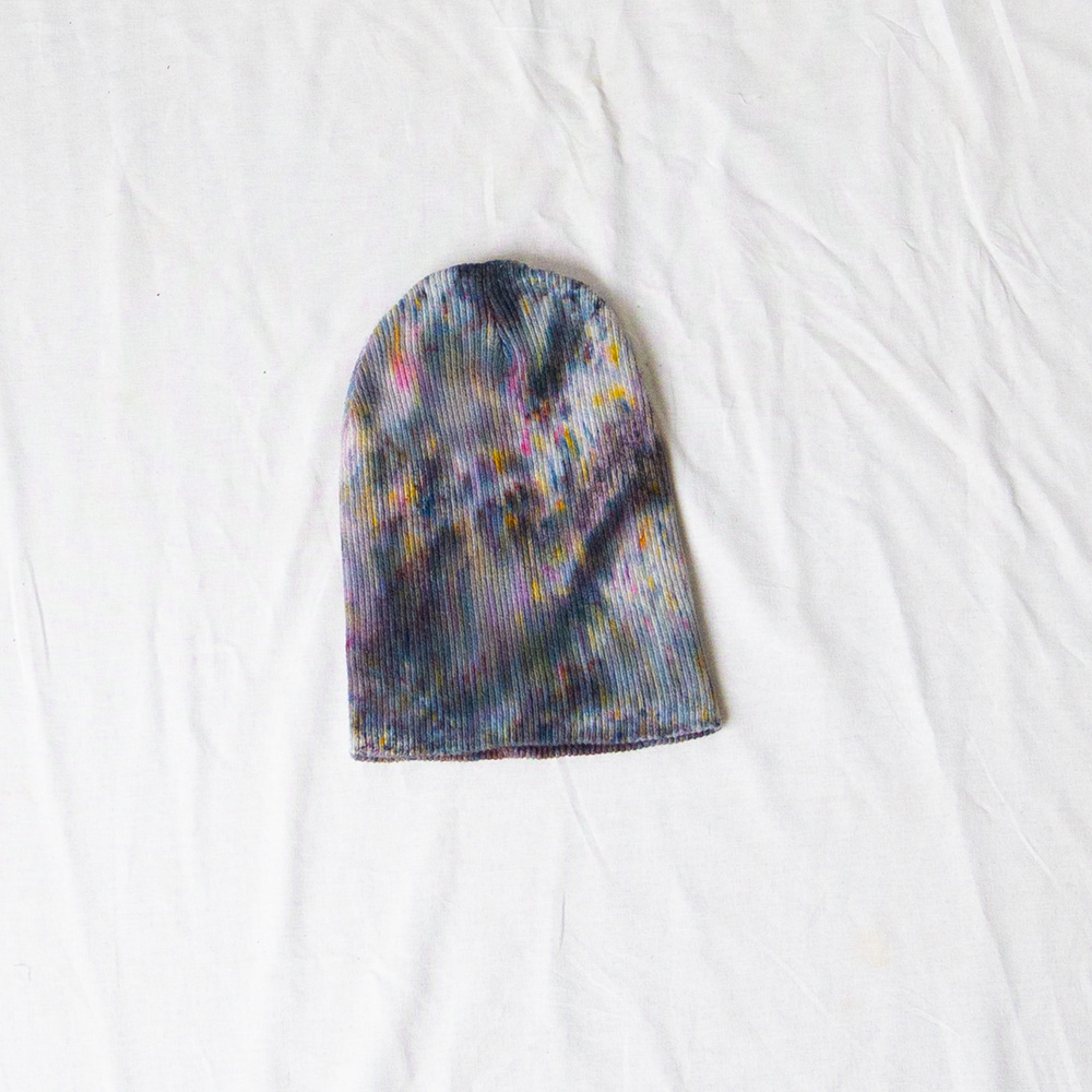 The Raven Beanie is knit from 100% cotton and measures approximately 7×10 inches when flat. The cotton construction breathes well and softens with washing, fitting most adult head sizes comfortably with a slight stretch. Each piece is hand dash-dyed using Dharma Procion MX fiber reactive dye — a powder pigment applied in small, intentional dashes and fixed permanently into the fiber. The color will not bleed or fade with normal washing. Care: machine wash cold, gentle cycle. Lay flat to dry.