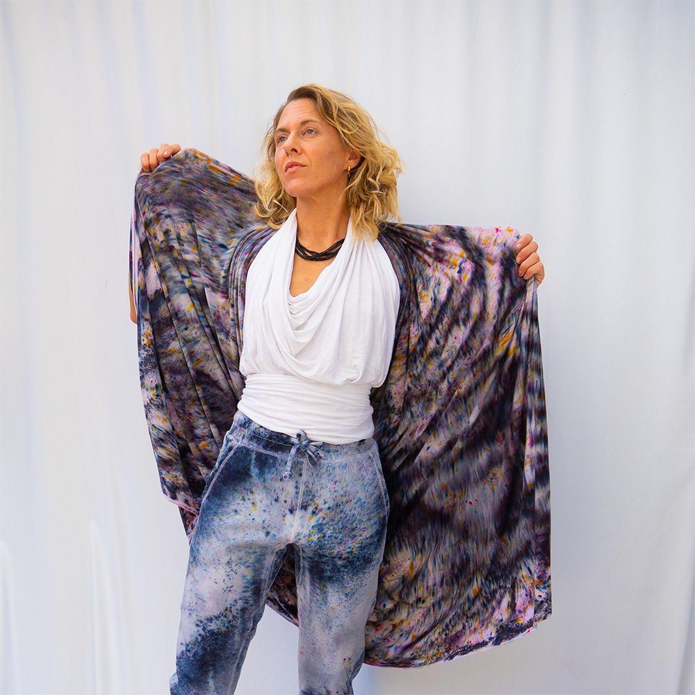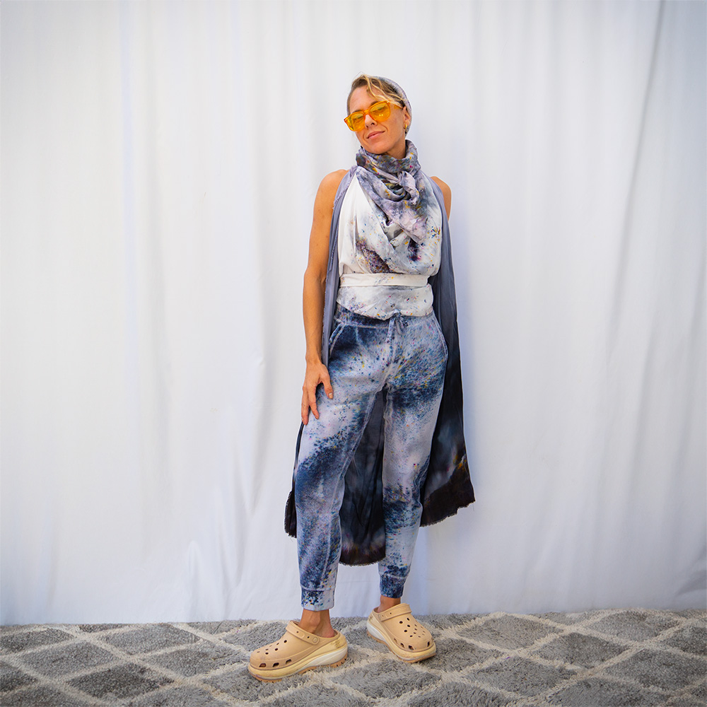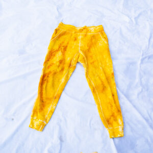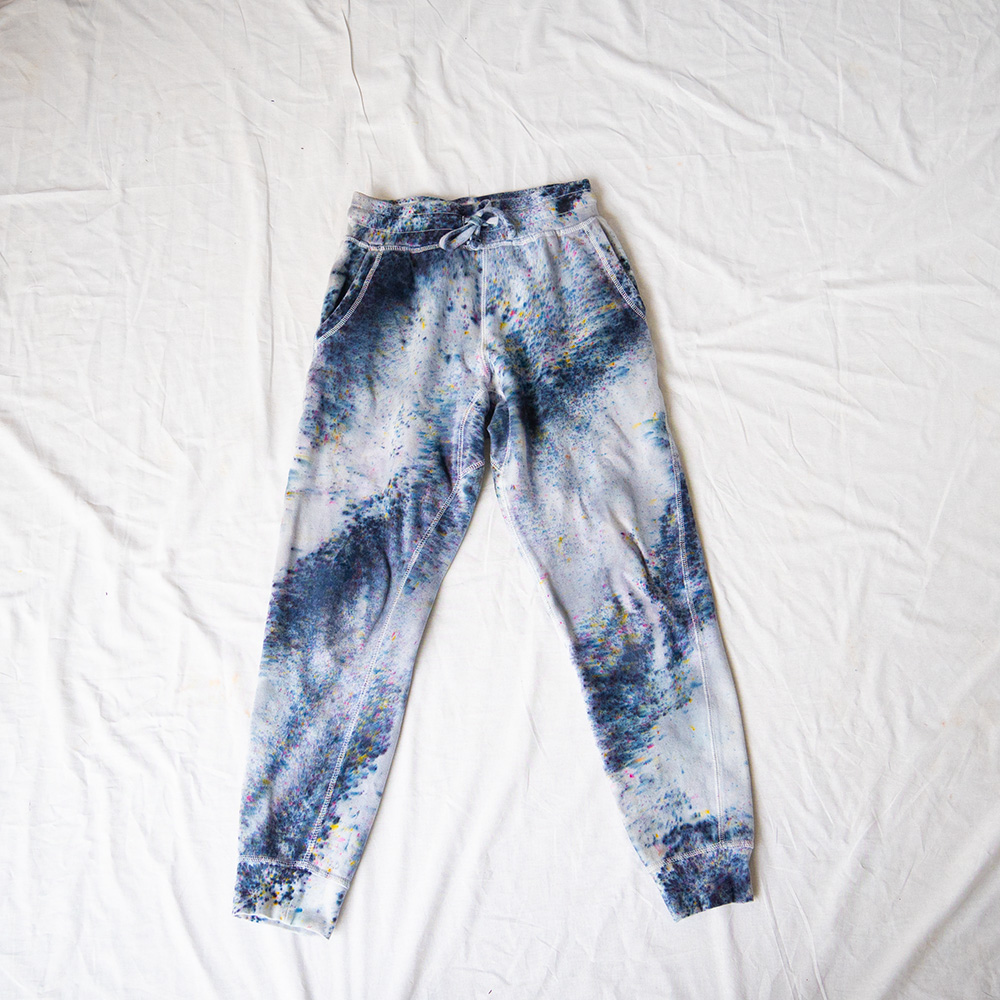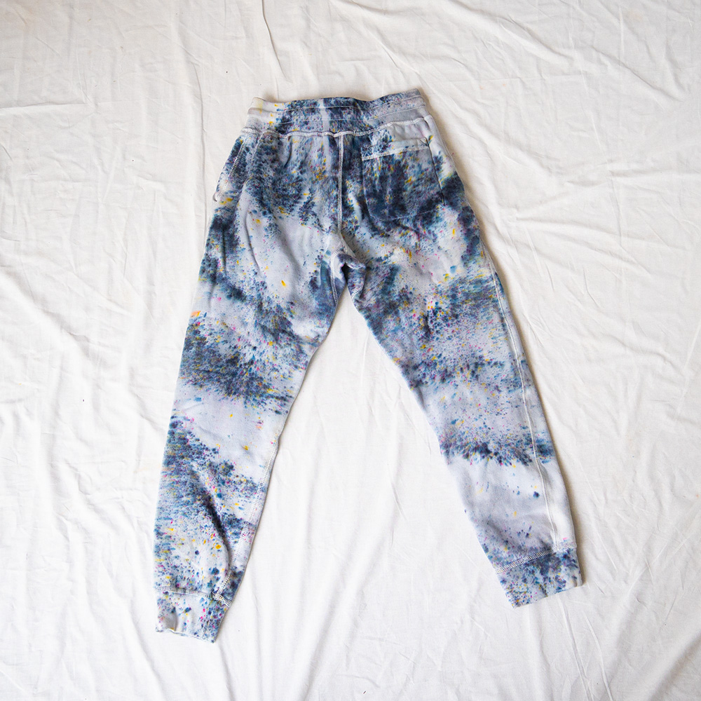 The Raven Joggers are cut from heavy-weight fleece — 80% cotton, 20% polyester — with a flat elastic waistband, cuff-ribbed ankles, two front pockets, and one back pocket. The drop crotch and tapered leg give a relaxed fit through the hip with a clean line from the knee down. Each pair is hand dash-dyed using Dharma Procion MX fiber reactive dye — a powder pigment applied in small, intentional dashes and fixed permanently into the cotton fibers. Care: machine wash cold. Tumble dry low. Do not iron the dyed areas.