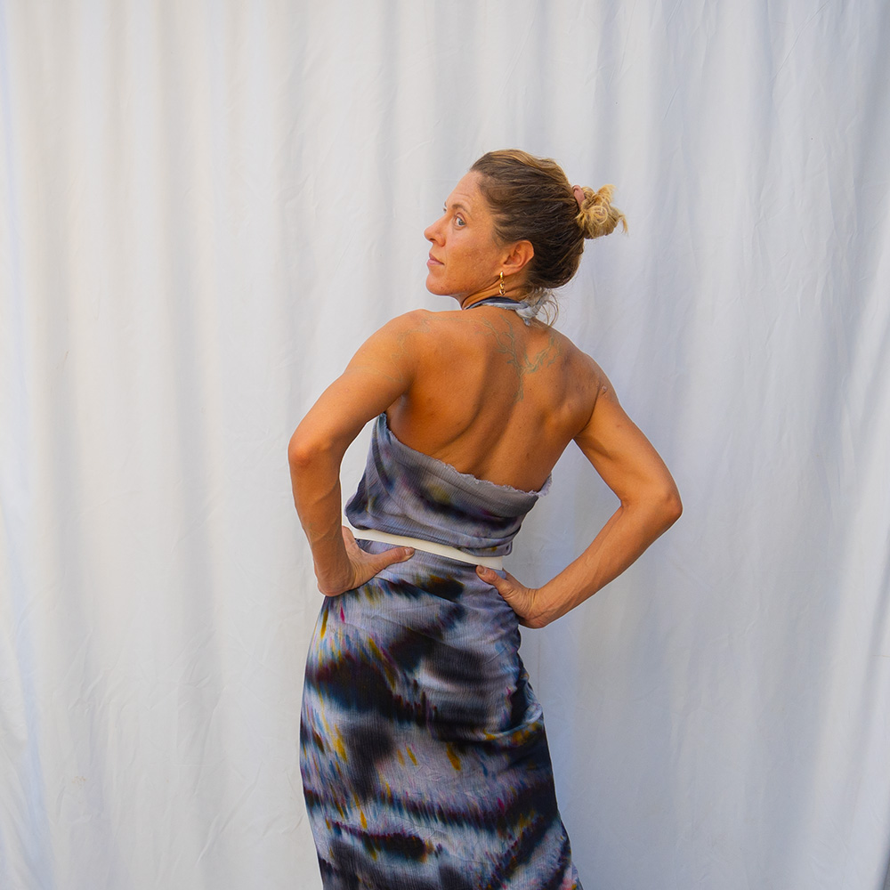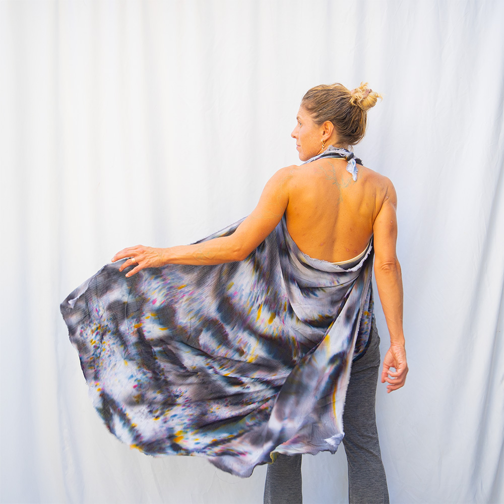 The Raven Square Wrap is a 50×50 inch square cut from 100% rayon. The generous size gives you full coverage as a wrap or shawl, and the lightweight rayon means it packs into nothing and emerges wrinkle-free. Each piece is hand dash-dyed using Dharma Procion MX fiber reactive dye — powder pigment fixed permanently into the fiber in small, deliberate dashes. The color is set, not coated, so it remains vivid through years of washing. Care: machine wash cold, regular cycle. Lay flat to dry. Do not iron.