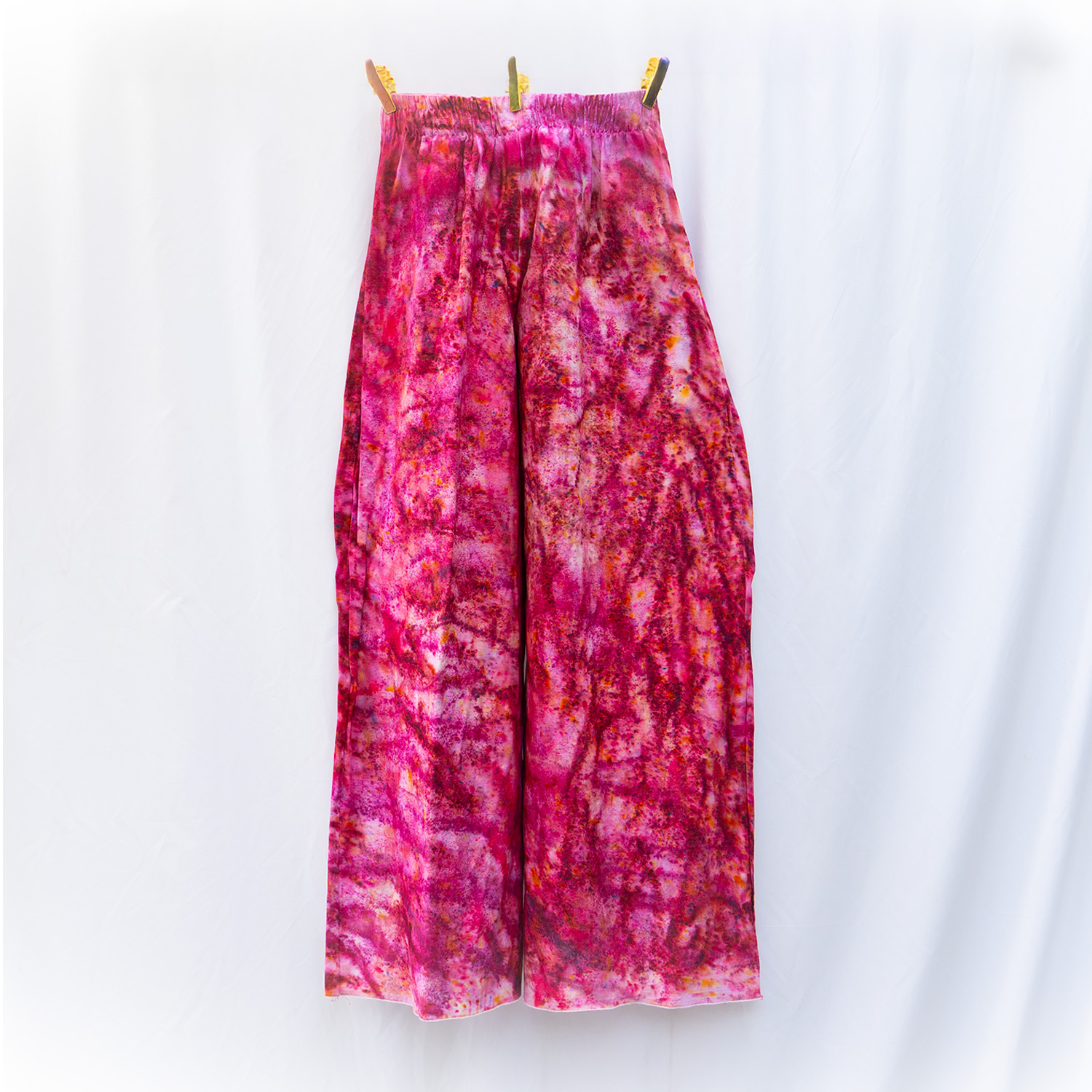 The Red Wine Denim Pants are cut from stretch denim — 70% cotton, 28% polyester, 2% spandex — with a 32-inch waist (stretch fit) and 34-inch inseam. The elastic waistband sits flat and stays put, and the fabric has enough recovery to layer easily over leggings or yoga pants. Each pair is hand dash-dyed using Dharma Procion MX fiber reactive dye — applied in small, deliberate amounts so the pigment bonds permanently to the cotton fibers. The color is in the fiber, not on it, so it holds up through repeated washing without fading. Care: machine wash cold. Tumble dry low. Do not iron the dyed areas.