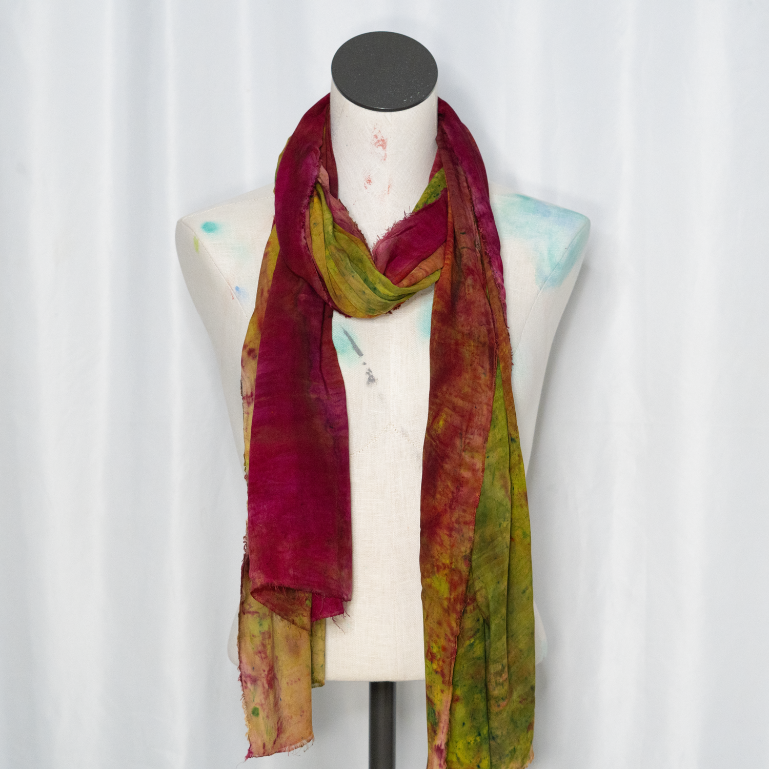 The Ruby Rose Slim Wrap is a 20×72 inch rectangle cut from 100% Rayon with eyelash fringe. The woven rayon has a silky drape and a slight sheen that catches light as you move. Each piece is hand dash-dyed using Dharma Procion MX fiber reactive dye — applied in intentional dashes so color saturates the fiber permanently. Care: machine wash cold, gentle cycle. Hang to dry. Iron on low heat.