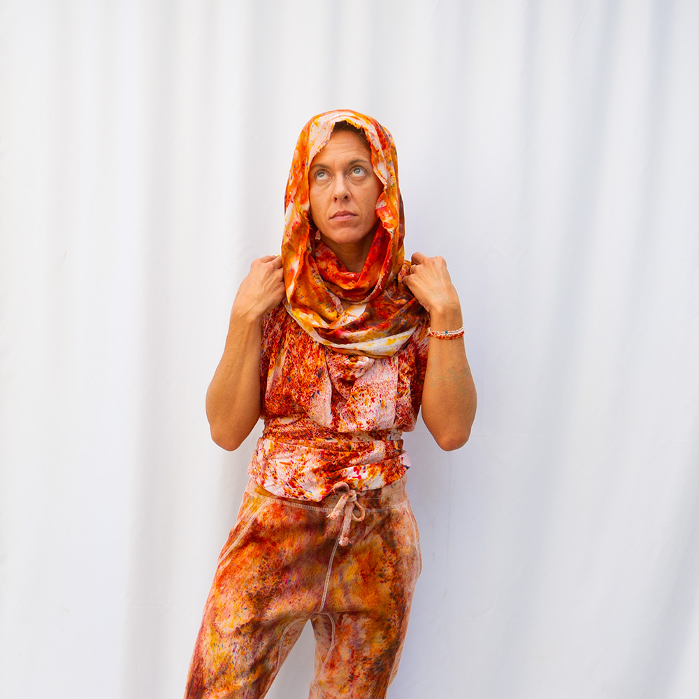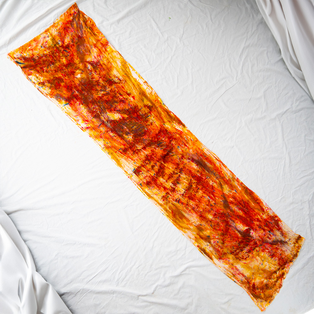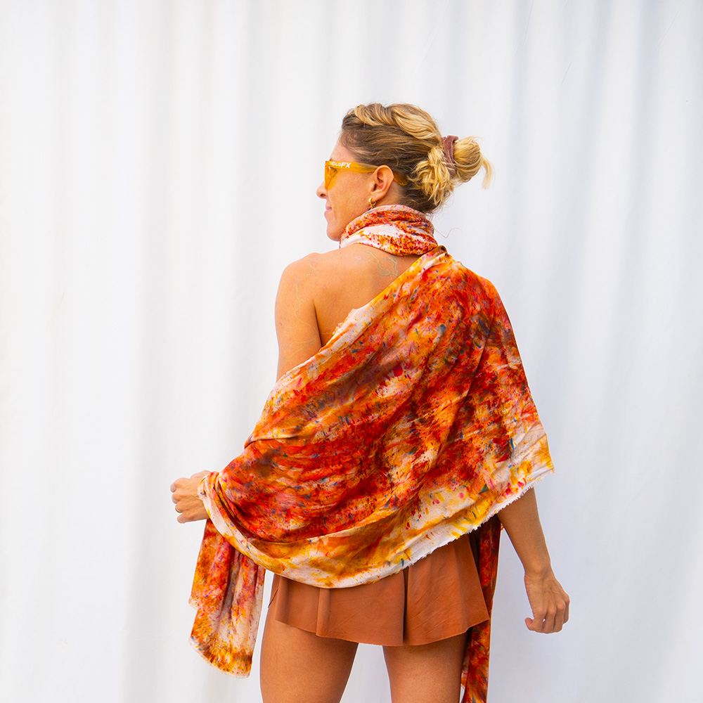 The Rust Slim Wrap is a 20×72 inch rectangle cut from 100% Rayon with eyelash fringe. The woven rayon has a silky drape and a slight sheen that catches light as you move. Each piece is hand dash-dyed using Dharma Procion MX fiber reactive dye — applied in intentional dashes so color saturates the fiber permanently. Care: machine wash cold, gentle cycle. Hang to dry. Iron on low heat.