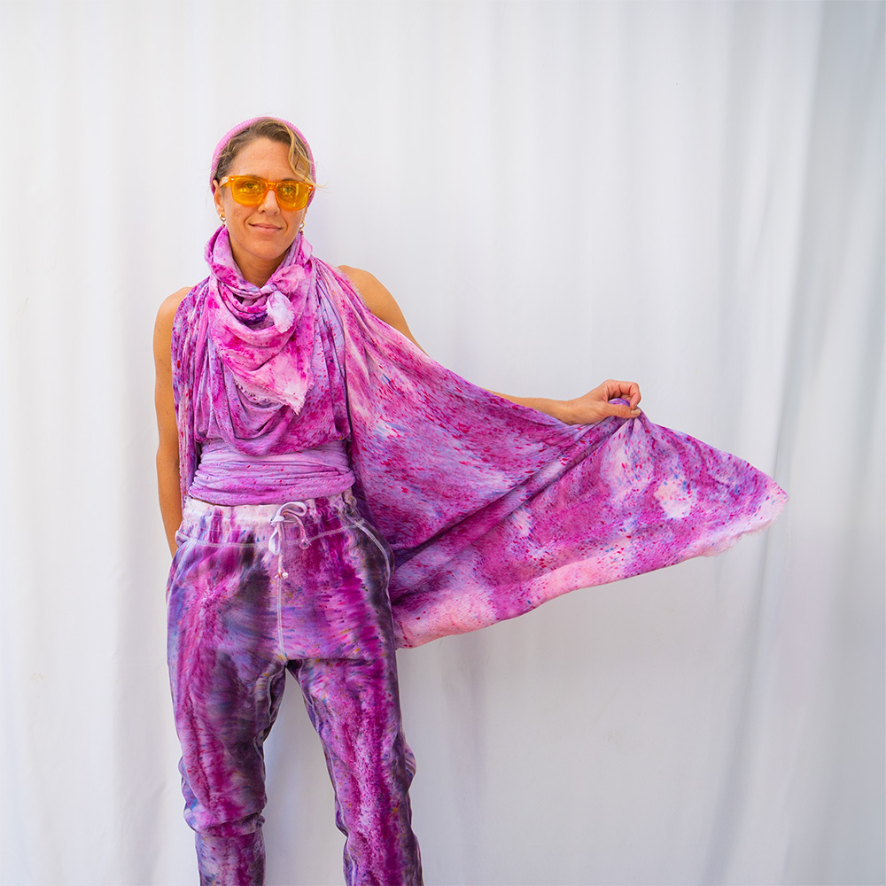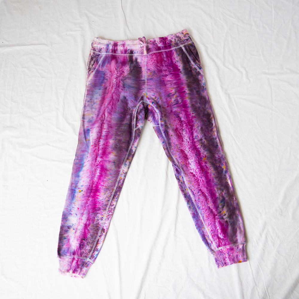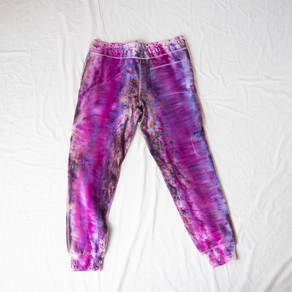 The Sweet Pea Joggers are cut from heavy-weight fleece — 80% cotton, 20% polyester — with a flat elastic waistband, cuff-ribbed ankles, two front pockets, and one back pocket. The drop crotch and tapered leg give a relaxed fit through the hip with a clean line from the knee down. Each pair is hand dash-dyed using Dharma Procion MX fiber reactive dye — a powder pigment applied in small, intentional dashes and fixed permanently into the cotton fibers. Care: machine wash cold. Tumble dry low. Do not iron the dyed areas.