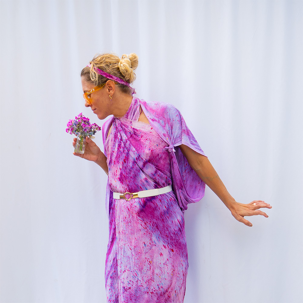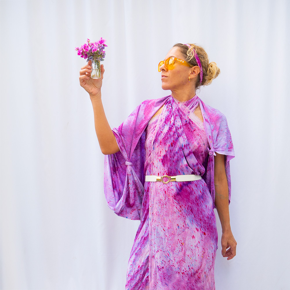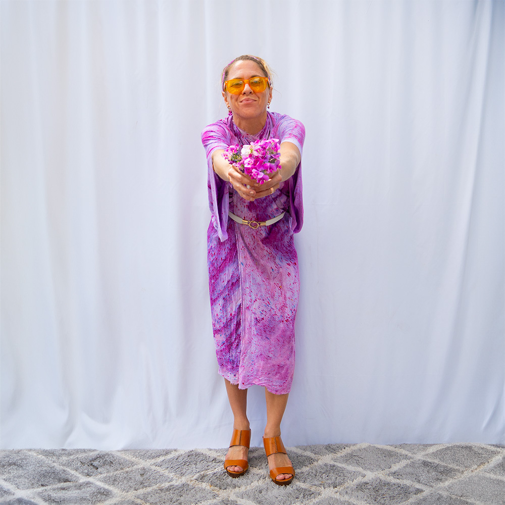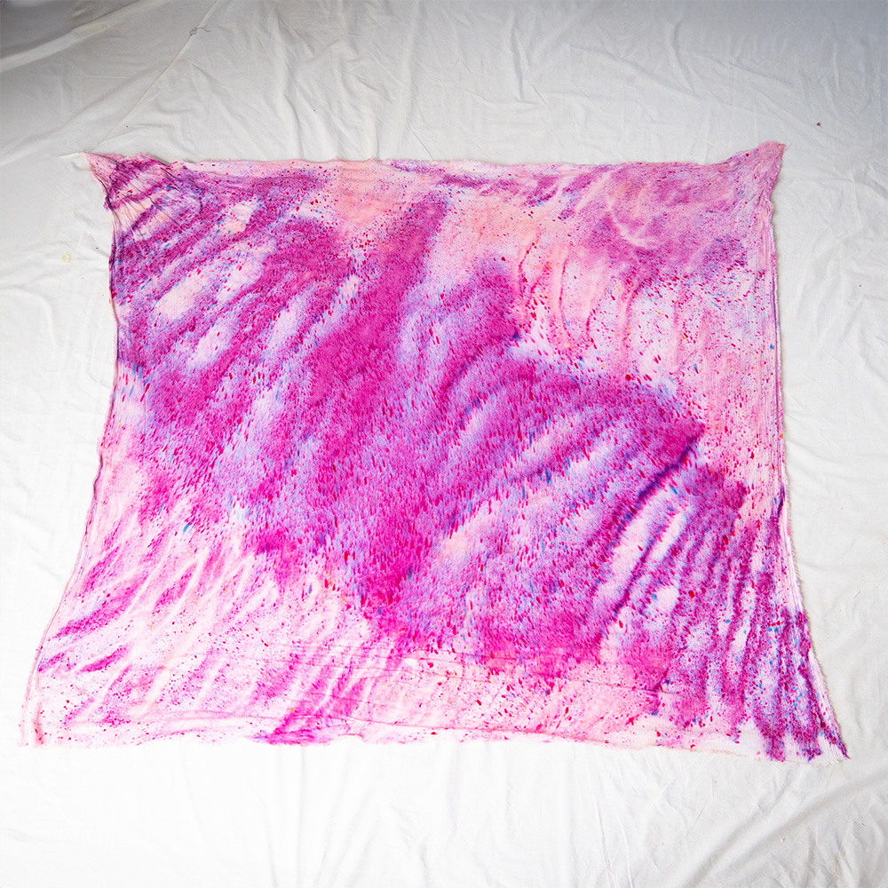 The Sweet Pea Square Wrap is a 50×50 inch square cut from 100% rayon. The generous size gives you full coverage as a wrap or shawl, and the lightweight rayon means it packs into nothing and emerges wrinkle-free. Each piece is hand dash-dyed using Dharma Procion MX fiber reactive dye — powder pigment fixed permanently into the fiber in small, deliberate dashes. The color is set, not coated, so it remains vivid through years of washing. Care: machine wash cold, regular cycle. Lay flat to dry. Do not iron.