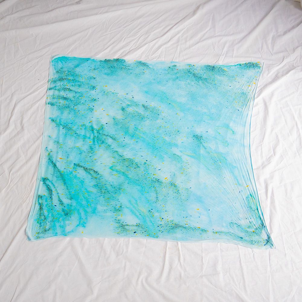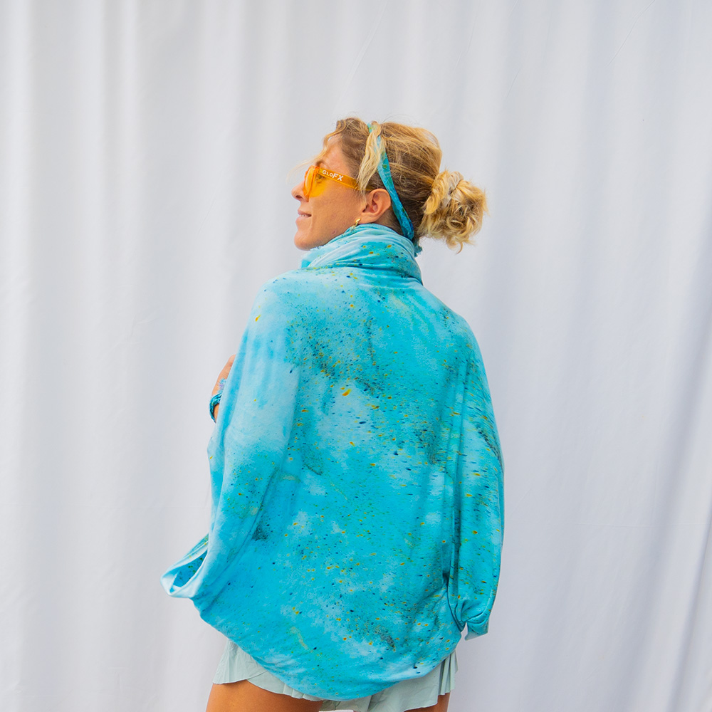The Celadon Halter Scarf is a 40×40 inch square cut from ultra-soft Rayon + Spandex knit. The knit construction has gentle stretch and recovery, draping softly against the body and holding its shape through repeated styling. Each piece is hand dash-dyed using Dharma Procion MX fiber reactive dye — applied in small, intentional amounts so color bonds permanently to the fiber. The result is a luminous, slightly varied depth of tone unique to each piece. Care: machine wash cold, gentle cycle. Lay flat or hang to dry. Do not iron.