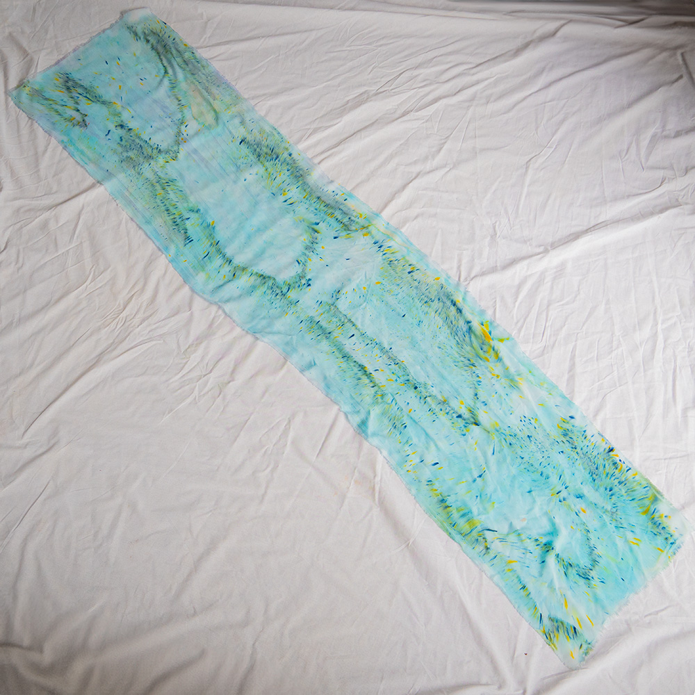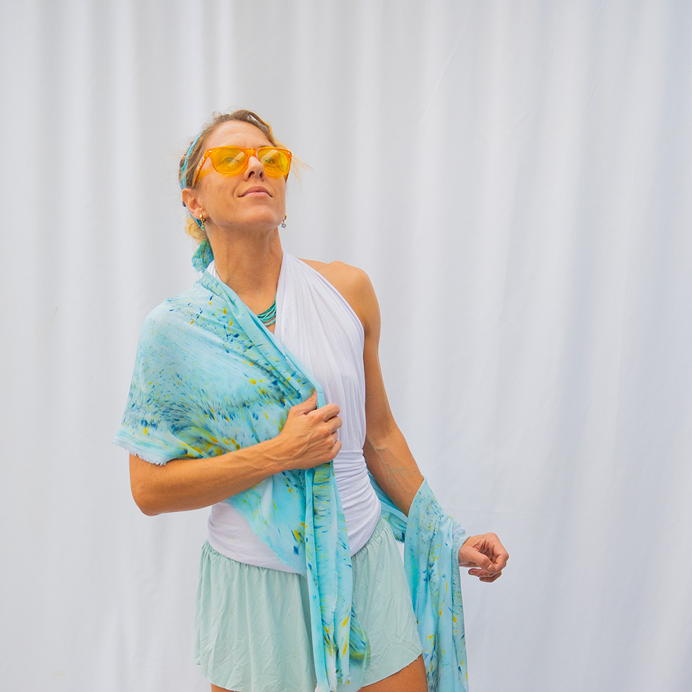 The Teal Slim Wrap is a 20×72 inch rectangle cut from 100% Rayon with eyelash fringe. The woven rayon has a silky drape and a slight sheen that catches light as you move. Each piece is hand dash-dyed using Dharma Procion MX fiber reactive dye — applied in intentional dashes so color saturates the fiber permanently. Care: machine wash cold, gentle cycle. Hang to dry. Iron on low heat.