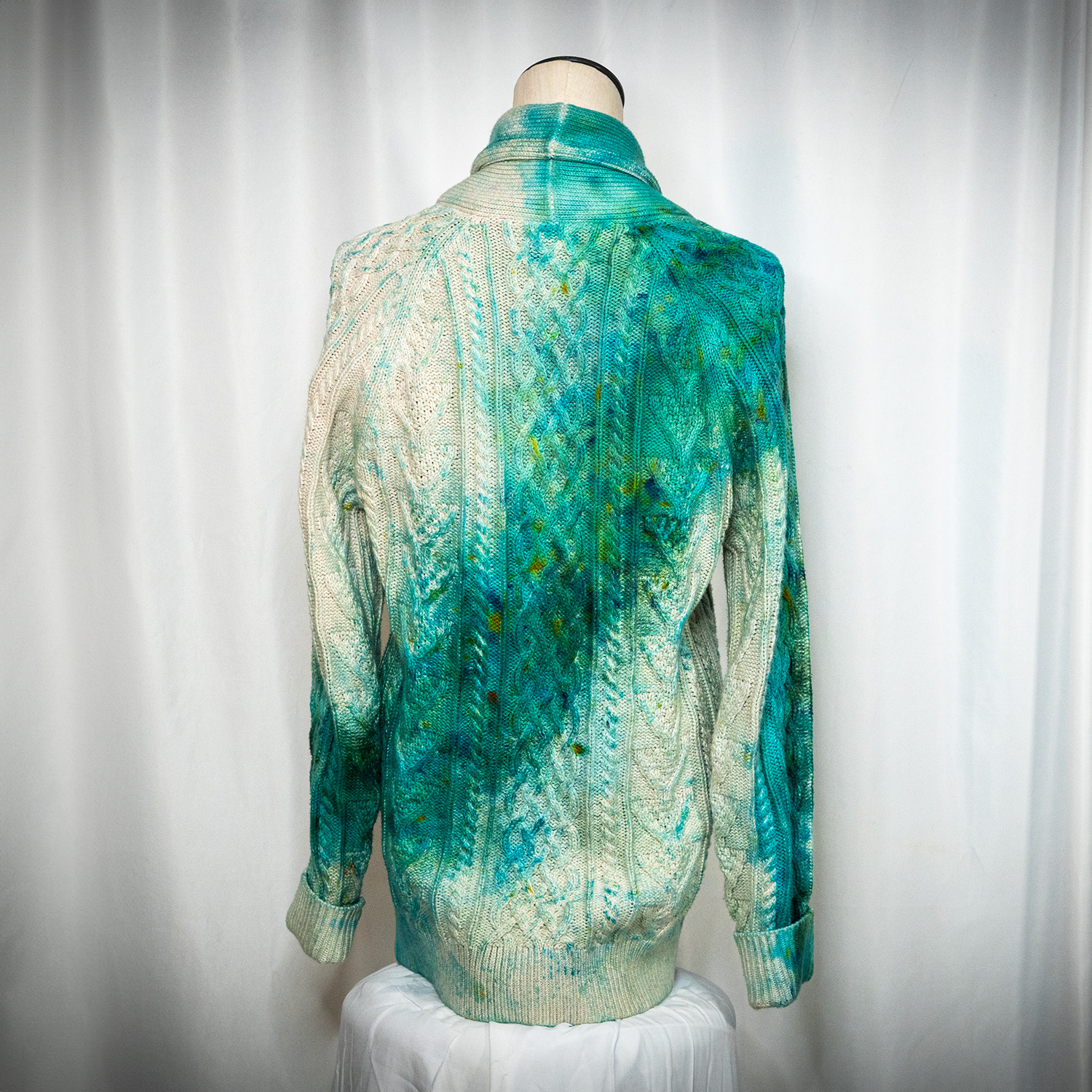 The Teal Cardigan is a J. Crew Heritage Cotton Cardigan, knit from 100% dense cotton with a classic shawl collar and cable-knit pattern. The compact knit is sturdy and breathable with a dry hand feel — structured enough to hold its shape, relaxed enough to wear all day. Each piece is hand dash-dyed using Dharma Procion MX fiber reactive dye applied in small, deliberate amounts so the color sets permanently into the cotton. Sizing is unisex. Care: machine wash cold. Lay flat to dry to preserve the knit structure.