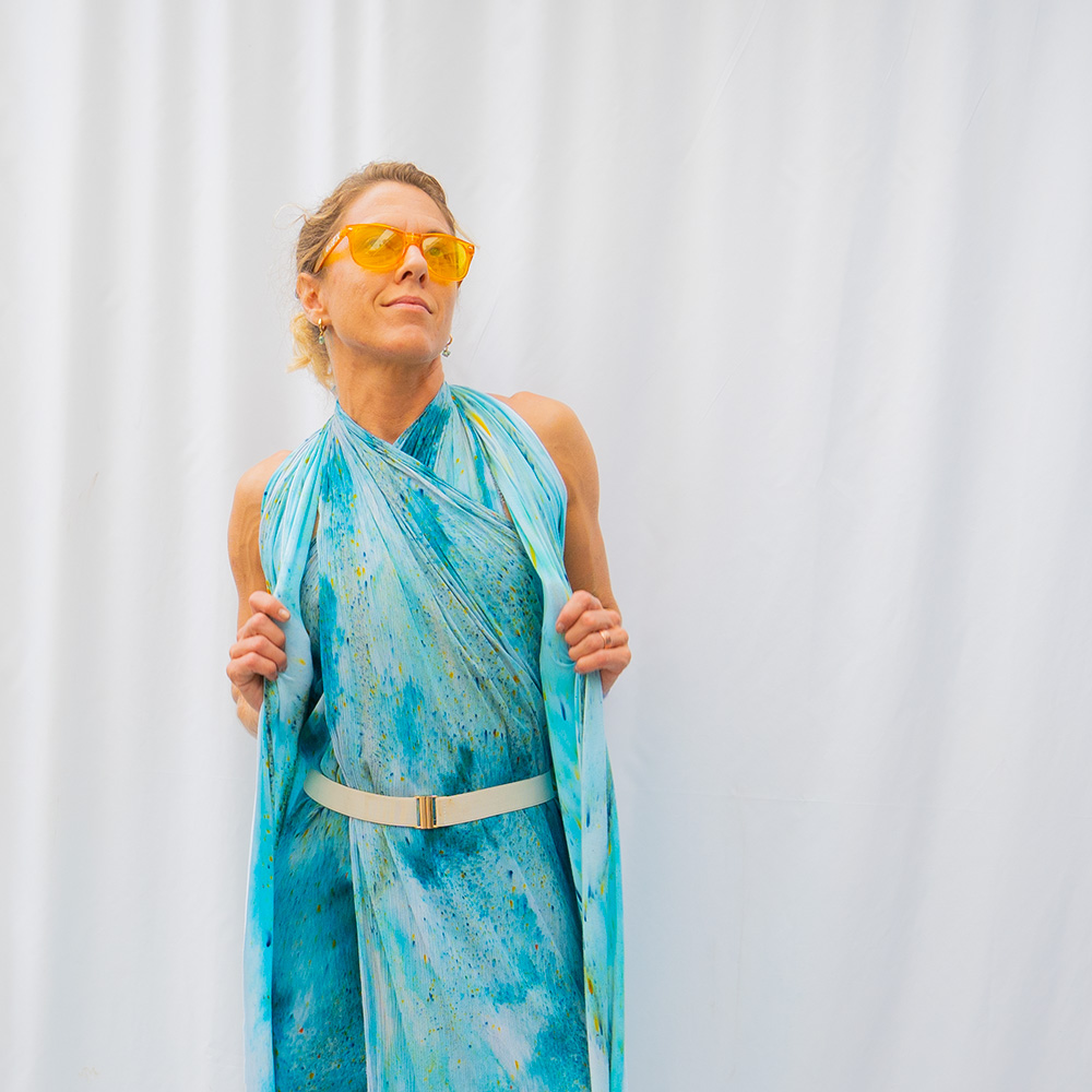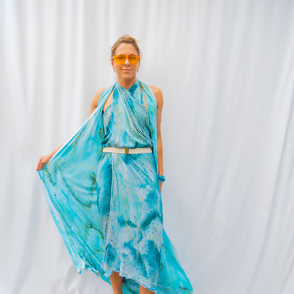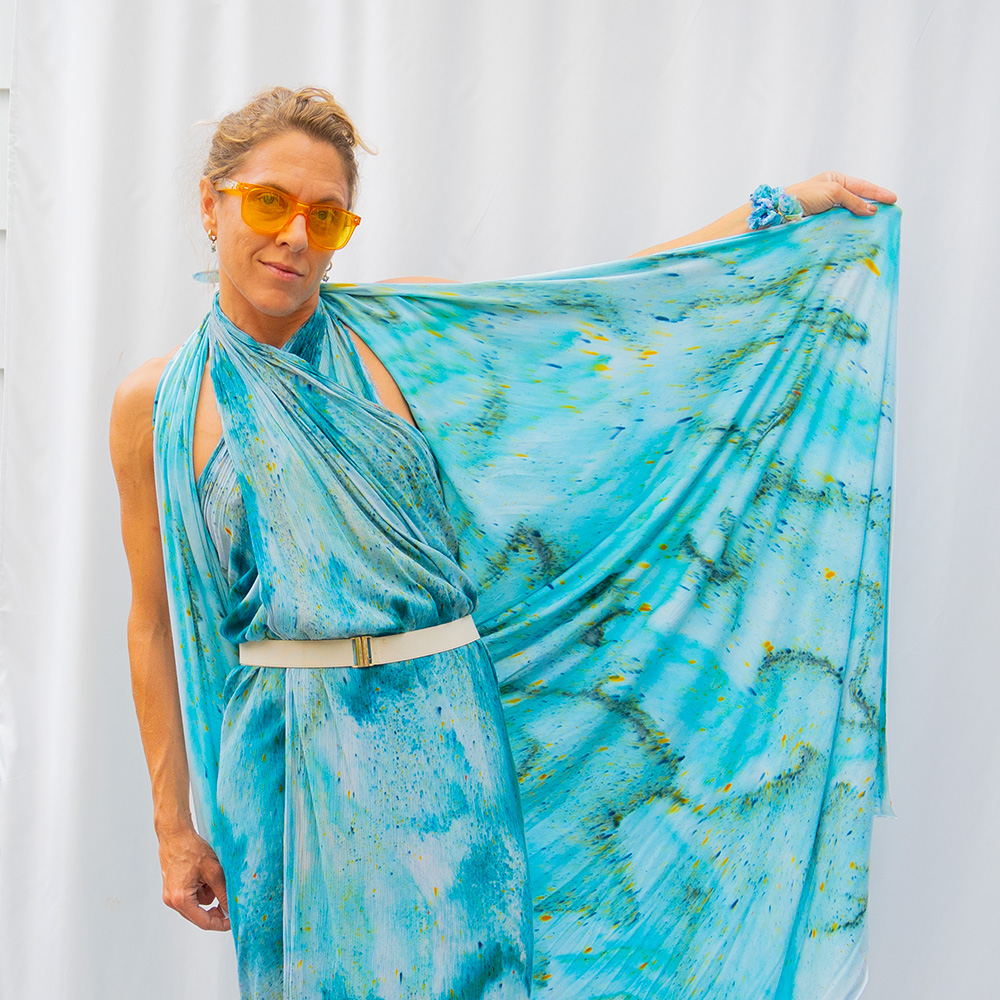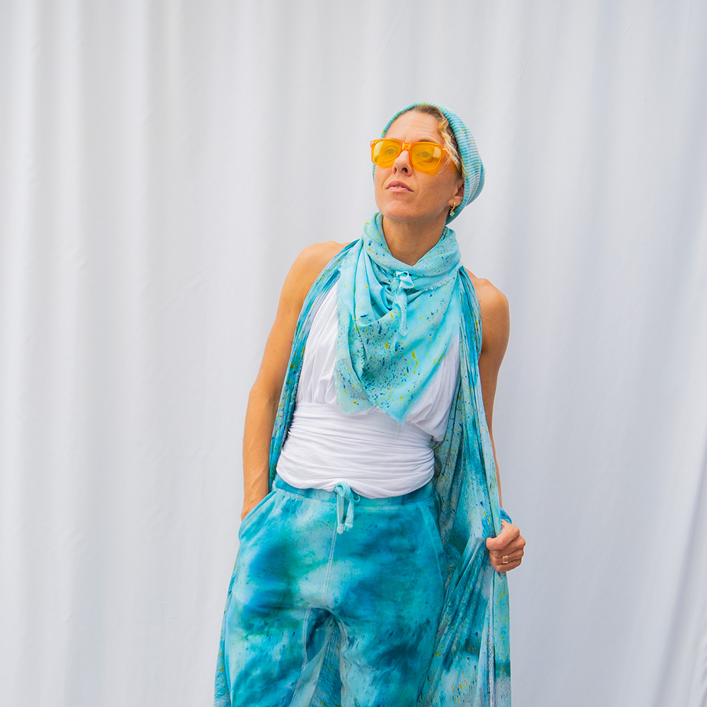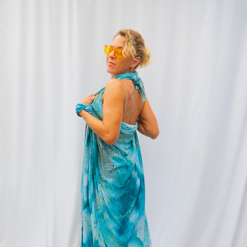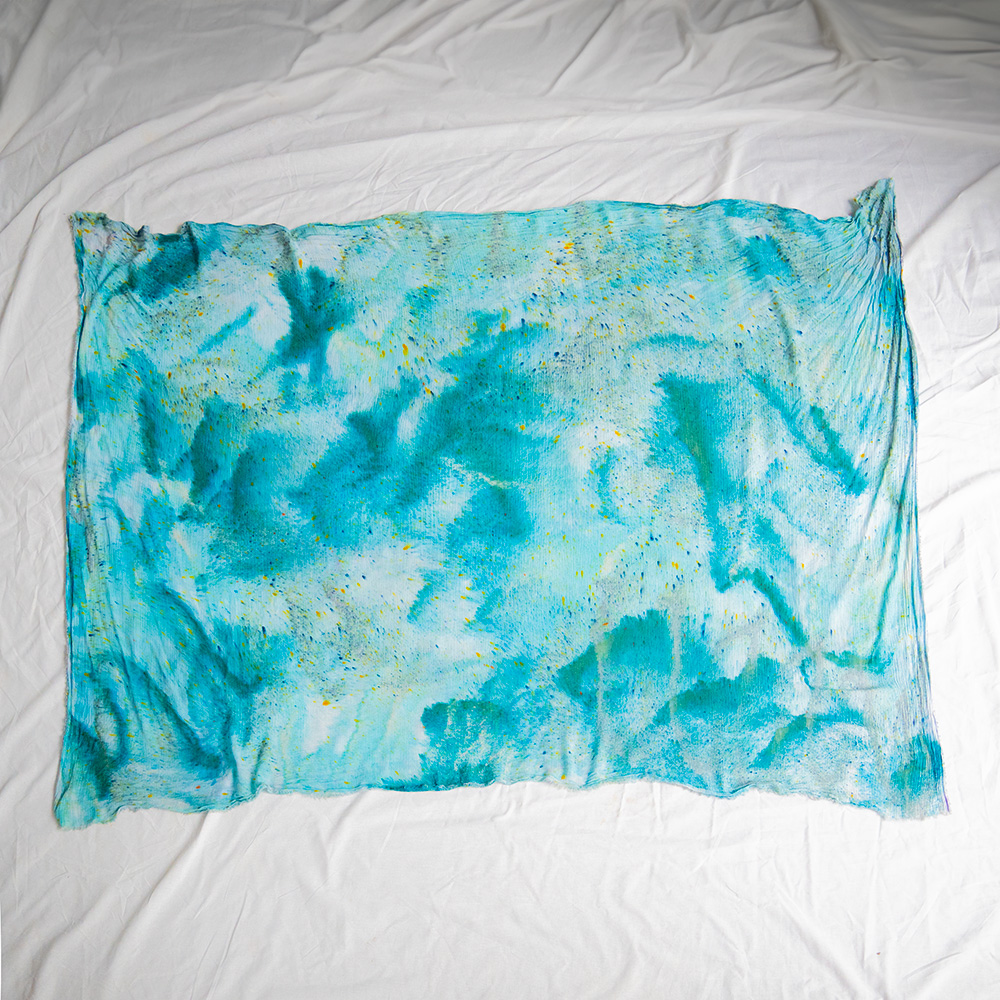 The Celadon Square Wrap is a 50×50 inch square cut from 100% rayon. The generous size gives you full coverage as a wrap or shawl, and the lightweight rayon means it packs into nothing and emerges wrinkle-free. Each piece is hand dash-dyed using Dharma Procion MX fiber reactive dye — powder pigment fixed permanently into the fiber in small, deliberate dashes. The color is set, not coated, so it remains vivid through years of washing. Care: machine wash cold, regular cycle. Lay flat to dry. Do not iron.