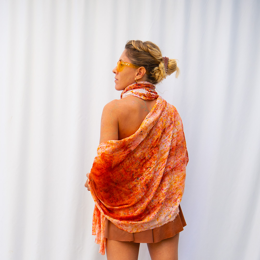 The Terracotta Slim Wrap is a 20×72 inch rectangle cut from 100% Rayon with eyelash fringe. The woven rayon has a silky drape and a slight sheen that catches light as you move. Each piece is hand dash-dyed using Dharma Procion MX fiber reactive dye — applied in intentional dashes so color saturates the fiber permanently. Care: machine wash cold, gentle cycle. Hang to dry. Iron on low heat.