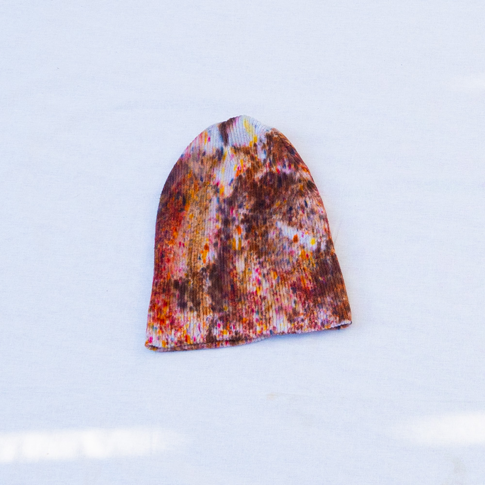 The Truffle Beanie is knit from 100% cotton and measures approximately 7×10 inches when flat. The cotton construction breathes well and softens with washing, fitting most adult head sizes comfortably with a slight stretch. Each piece is hand dash-dyed using Dharma Procion MX fiber reactive dye — a powder pigment applied in small, intentional dashes and fixed permanently into the fiber. The color will not bleed or fade with normal washing. Care: machine wash cold, gentle cycle. Lay flat to dry.