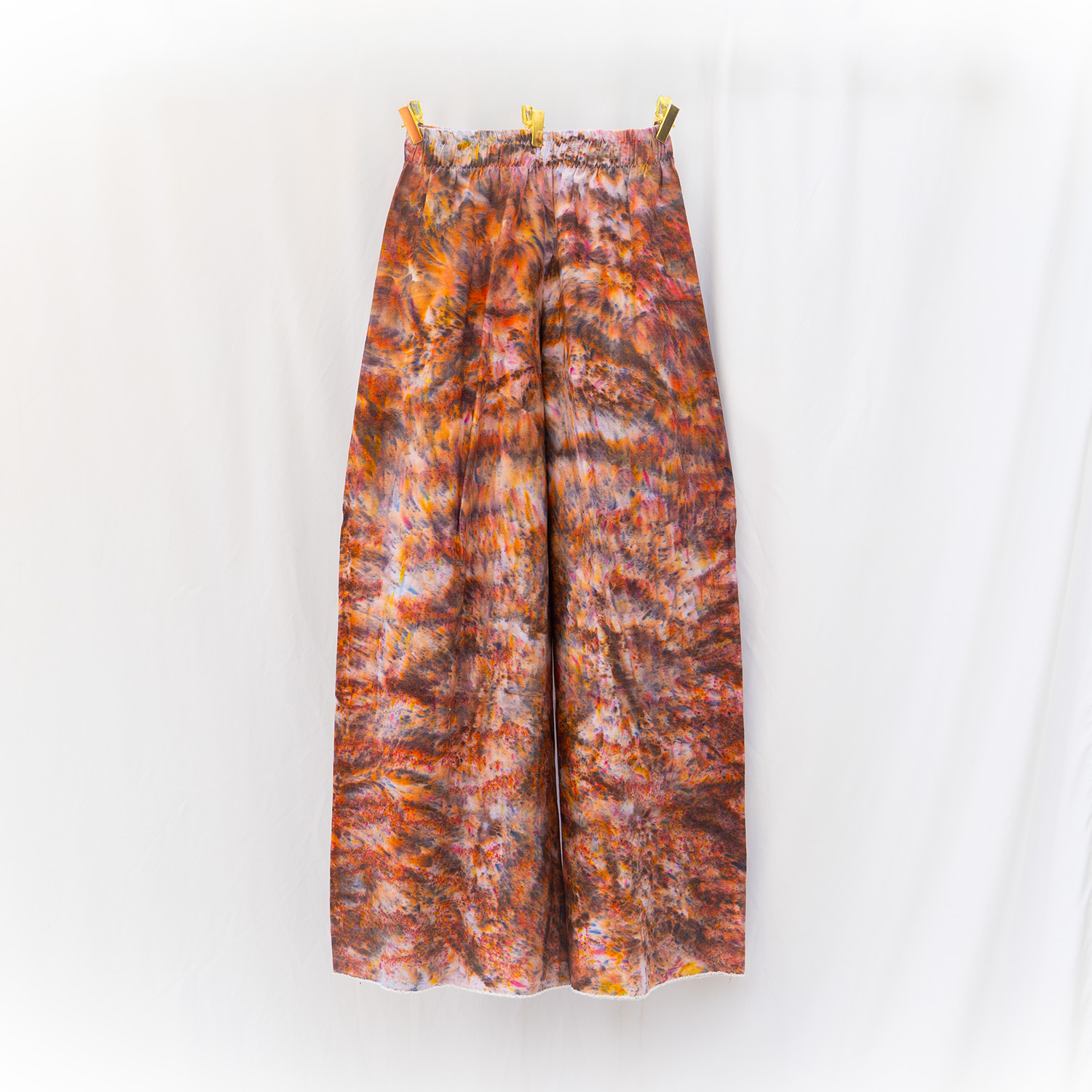 The Truffle Brown Denim Pants are cut from stretch denim — 70% cotton, 28% polyester, 2% spandex — with a 32-inch waist (stretch fit) and 34-inch inseam. The elastic waistband sits flat and stays put, and the fabric has enough recovery to layer easily over leggings or yoga pants. Each pair is hand dash-dyed using Dharma Procion MX fiber reactive dye — applied in small, deliberate amounts so the pigment bonds permanently to the cotton fibers. The color is in the fiber, not on it, so it holds up through repeated washing without fading. Care: machine wash cold. Tumble dry low. Do not iron the dyed areas.