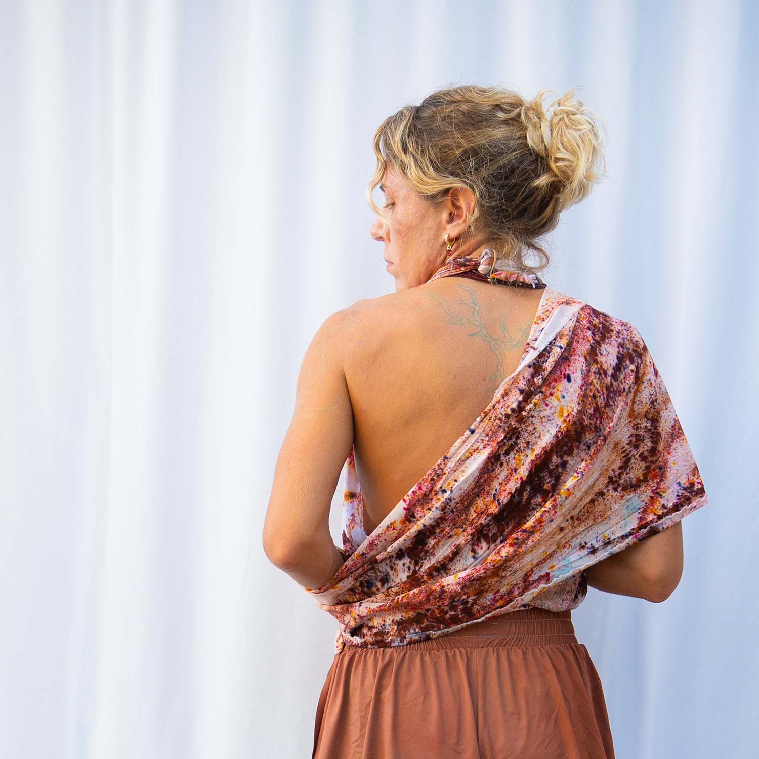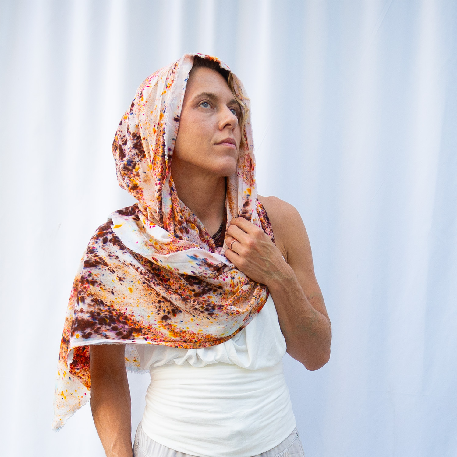 The Truffle Slim Wrap is a 20×72 inch rectangle cut from 100% Rayon with eyelash fringe. The woven rayon has a silky drape and a slight sheen that catches light as you move. Each piece is hand dash-dyed using Dharma Procion MX fiber reactive dye — applied in intentional dashes so color saturates the fiber permanently. Care: machine wash cold, gentle cycle. Hang to dry. Iron on low heat.