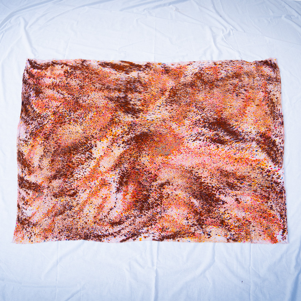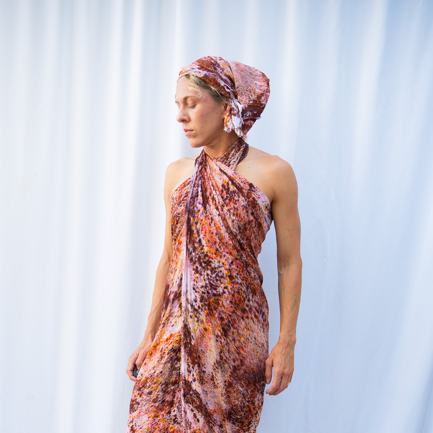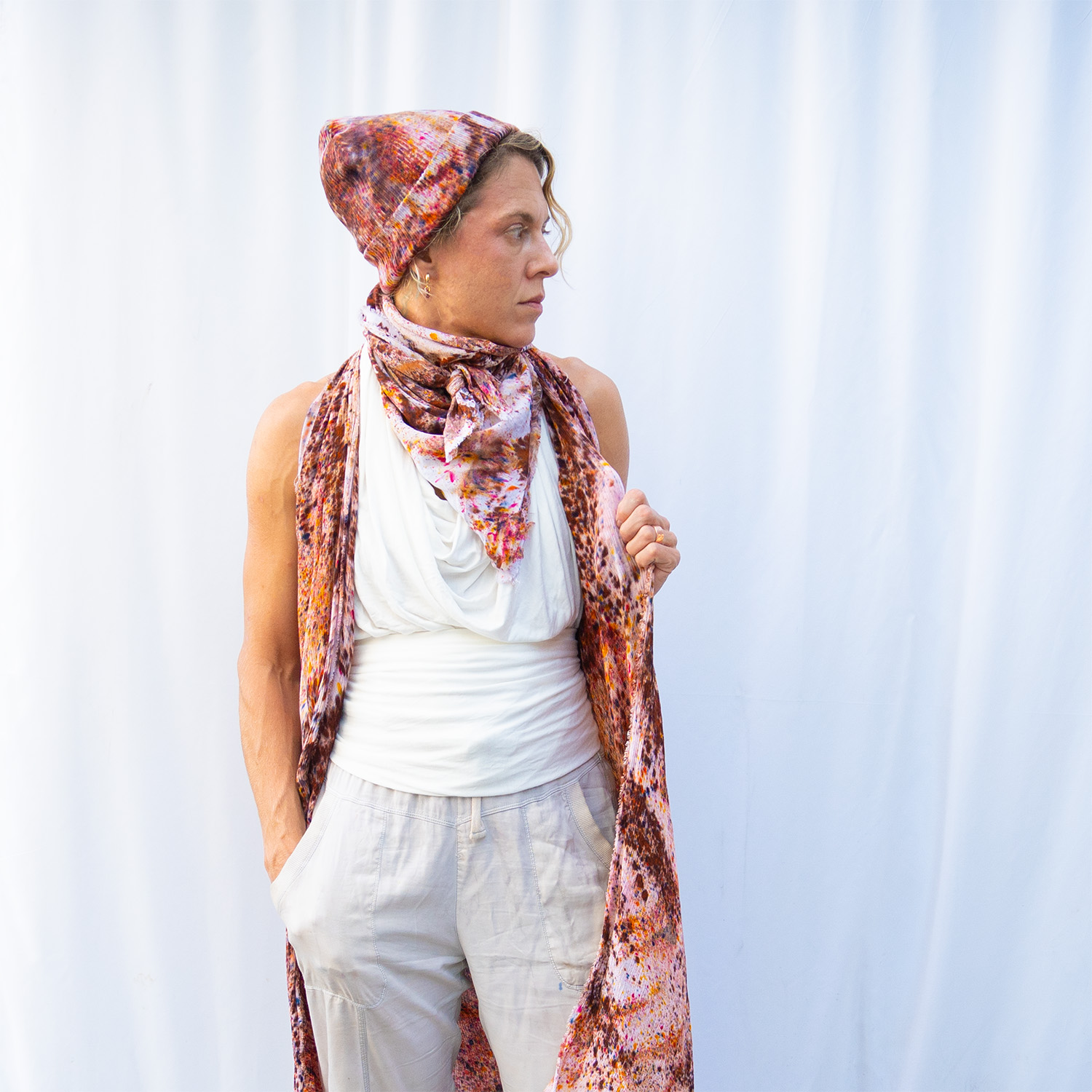 The Truffle Square Wrap is a 50×50 inch square cut from 100% rayon. The generous size gives you full coverage as a wrap or shawl, and the lightweight rayon means it packs into nothing and emerges wrinkle-free. Each piece is hand dash-dyed using Dharma Procion MX fiber reactive dye — powder pigment fixed permanently into the fiber in small, deliberate dashes. The color is set, not coated, so it remains vivid through years of washing. Care: machine wash cold, regular cycle. Lay flat to dry. Do not iron.