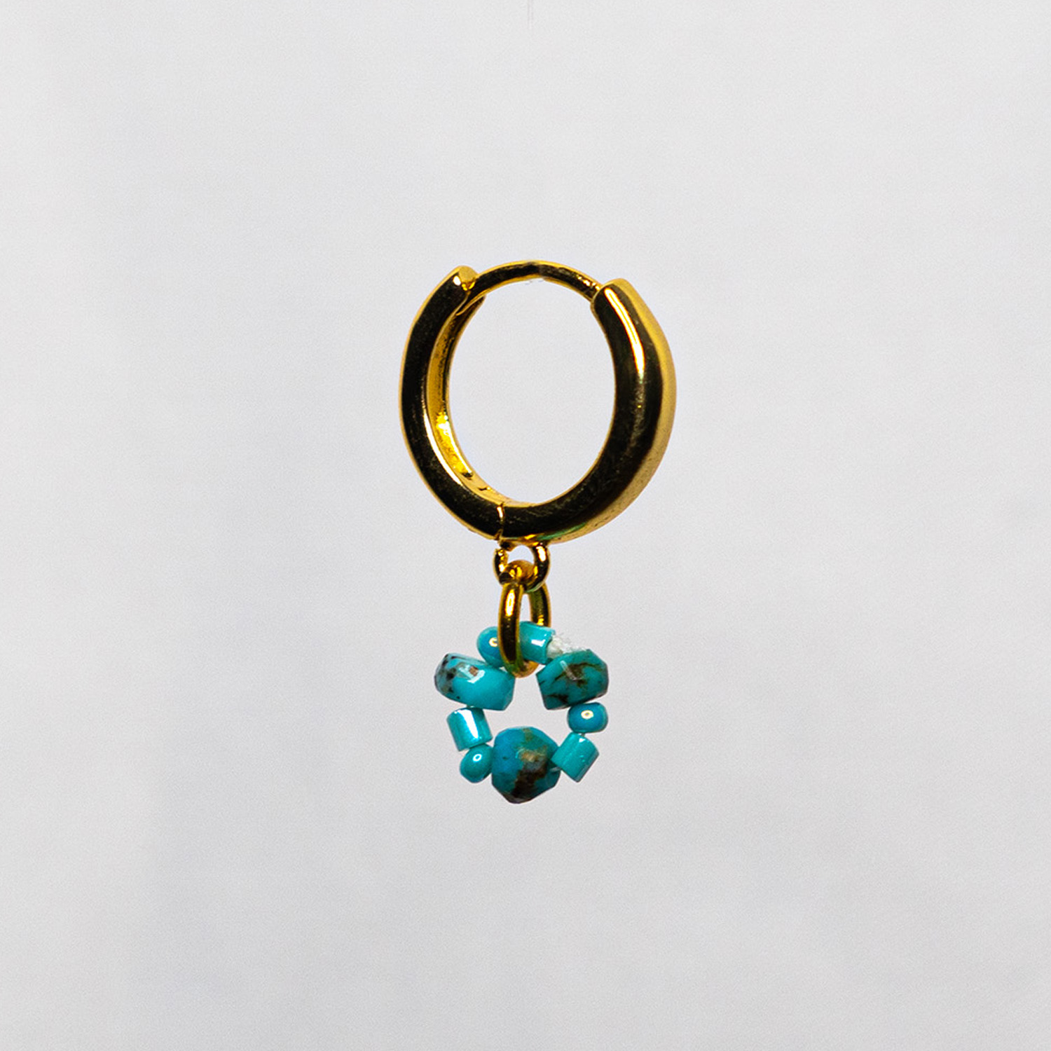 The Turquoise Earrings pair gemstone gemstones with Czech Preciosa Ornela beads on 18k gold huggie hoops — small enough to wear every day, interesting enough to earn a compliment.