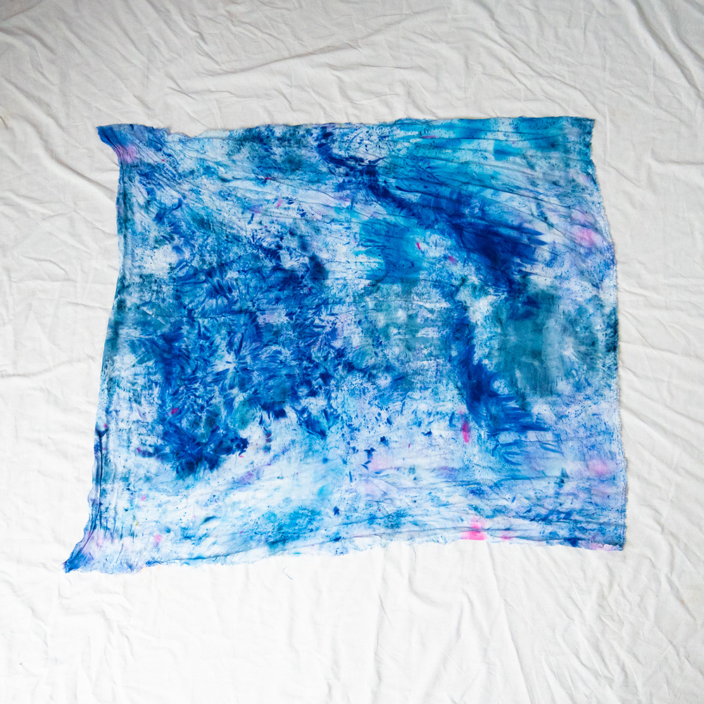 The Ultramarine Wild Rag is a 36×36 inch square scarf cut from 100% Rayon. Rayon drapes with a fluid, silk-like weight that holds a knot beautifully and moves with you all day. Each piece is hand dash-dyed using Dharma Procion MX fiber reactive dye — a powder pigment mixed with a fixative and applied in small, intentional dashes so the color sets permanently into the fiber. No two pieces are identical. Care: machine wash cold, gentle cycle. Hang or lay flat to dry. Do not iron.