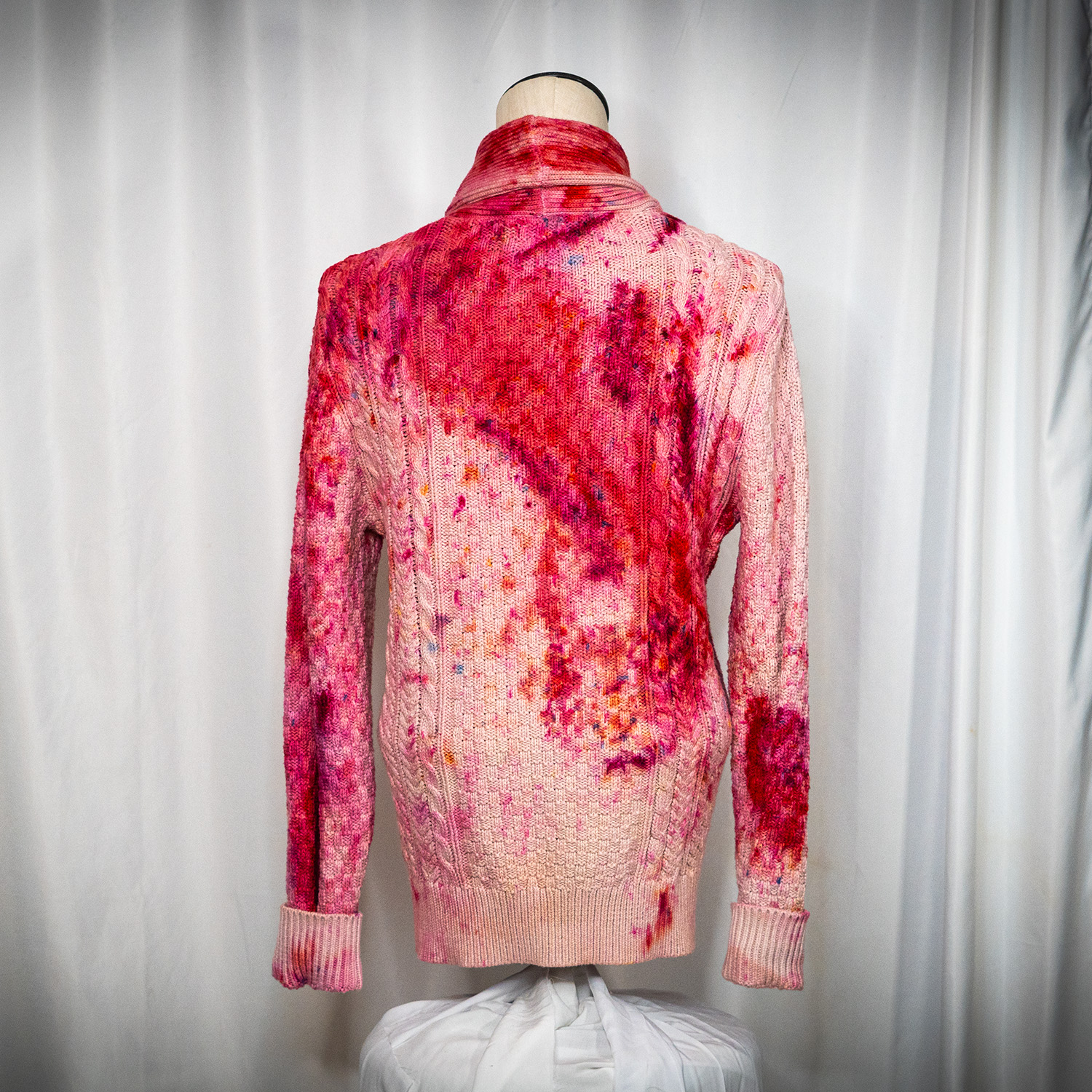 The Watermelon Red Cardigan is a J. Crew Heritage Cotton Cardigan, knit from 100% dense cotton with a classic shawl collar and cable-knit pattern. The compact knit is sturdy and breathable with a dry hand feel — structured enough to hold its shape, relaxed enough to wear all day. Each piece is hand dash-dyed using Dharma Procion MX fiber reactive dye applied in small, deliberate amounts so the color sets permanently into the cotton. Sizing is unisex. Care: machine wash cold. Lay flat to dry to preserve the knit structure.