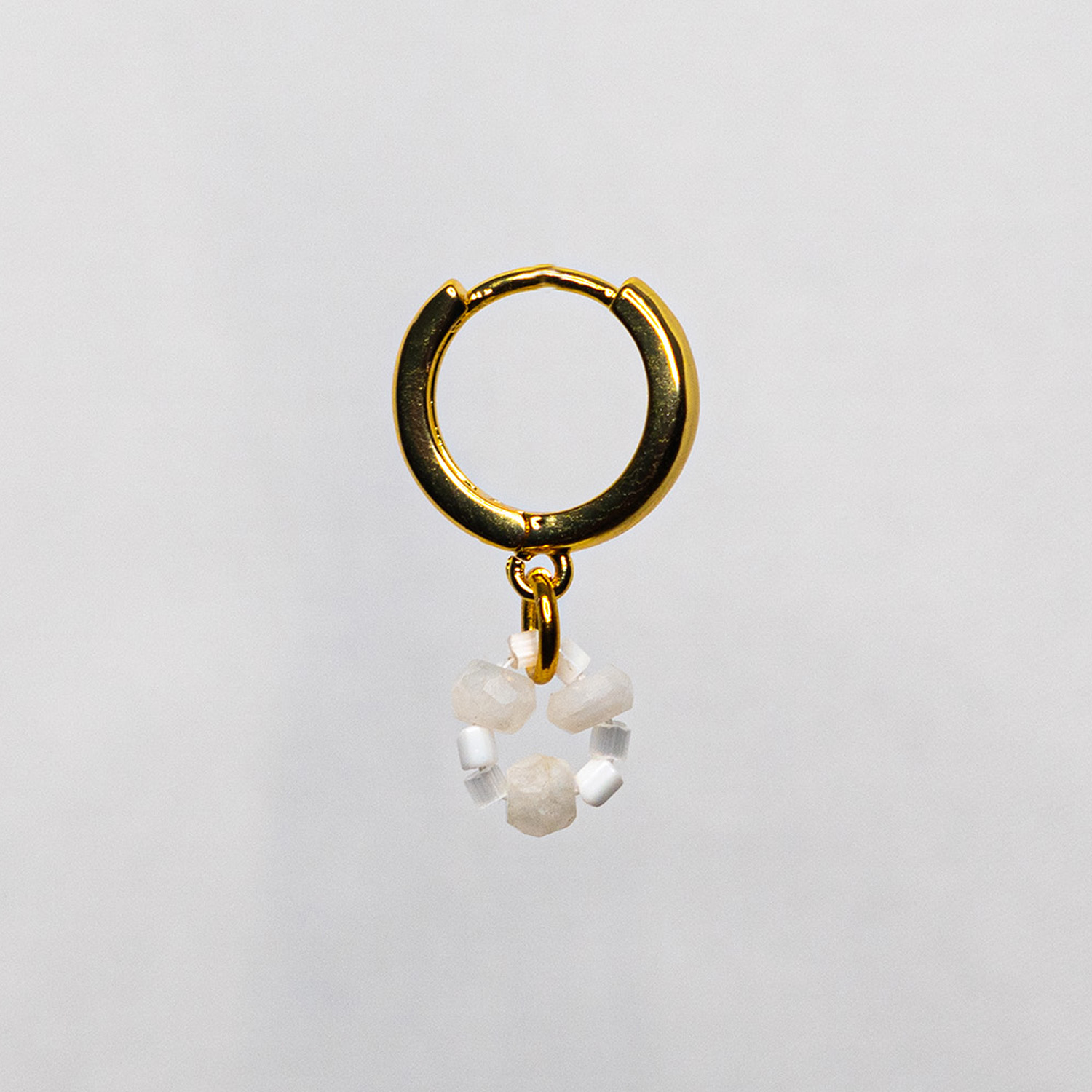 The White Moonstone Earrings pair Moonstone gemstones with Czech Preciosa Ornela beads on 18k gold huggie hoops — small enough to wear every day, interesting enough to earn a compliment.
