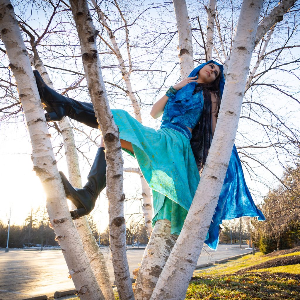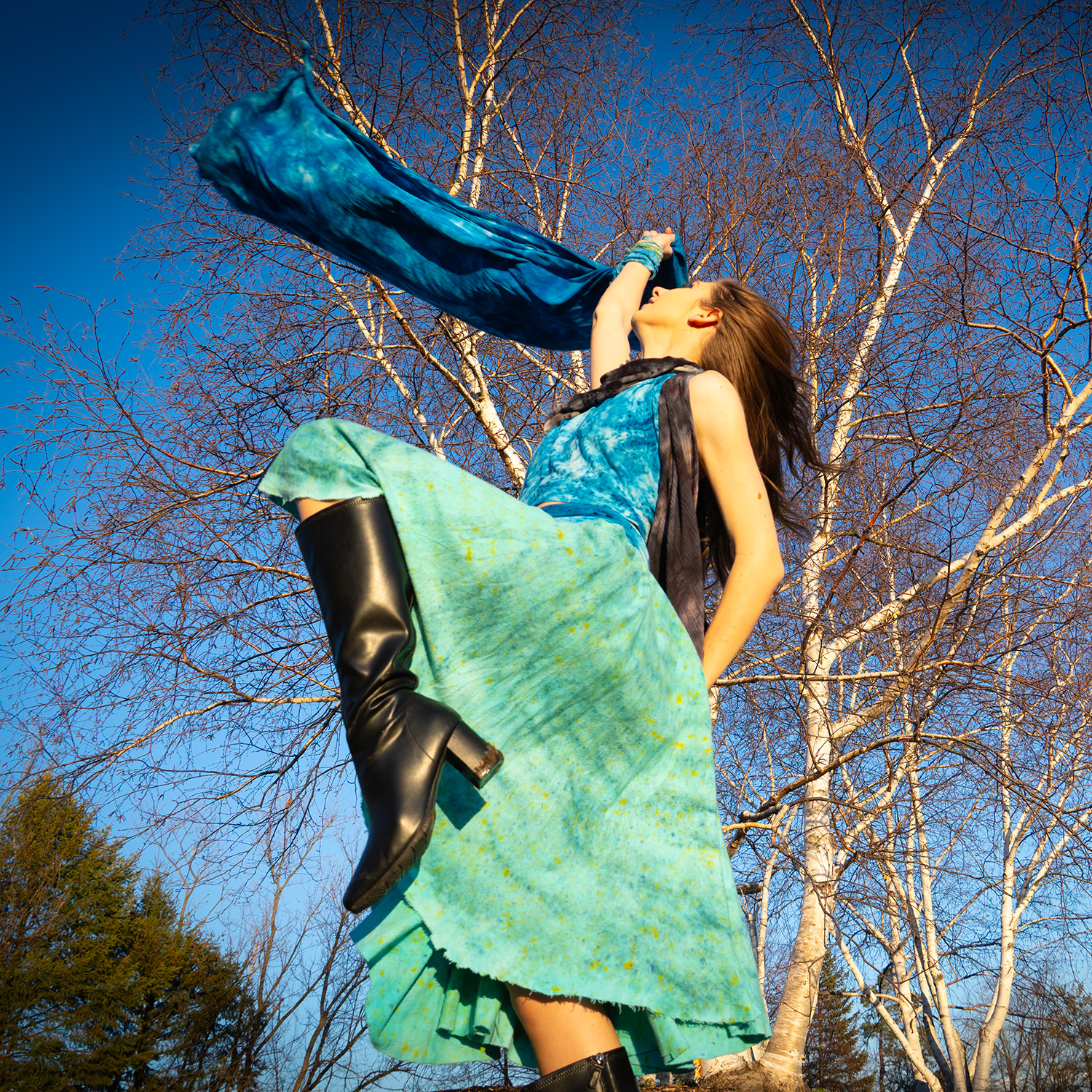 We tried multiple silhouettes, but this final one won because of the flow. Indigo buntings are small but kinetic — alert, perched high, ready to dart. The shawl created wing movement. The gradient held that the structural-light illusion — shifting slightly with the sun.