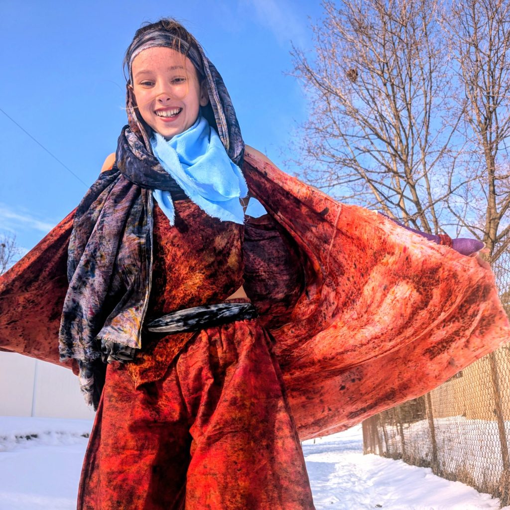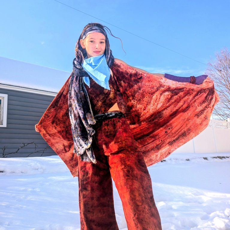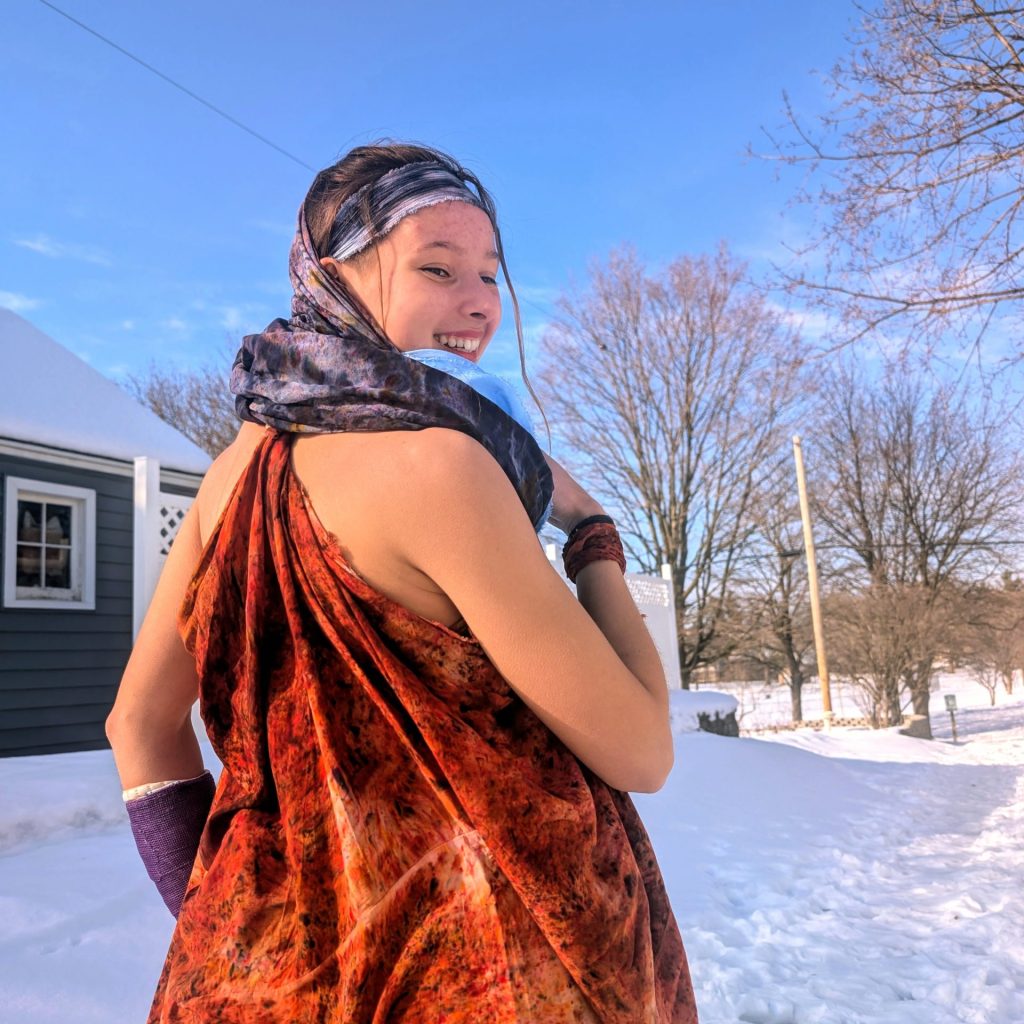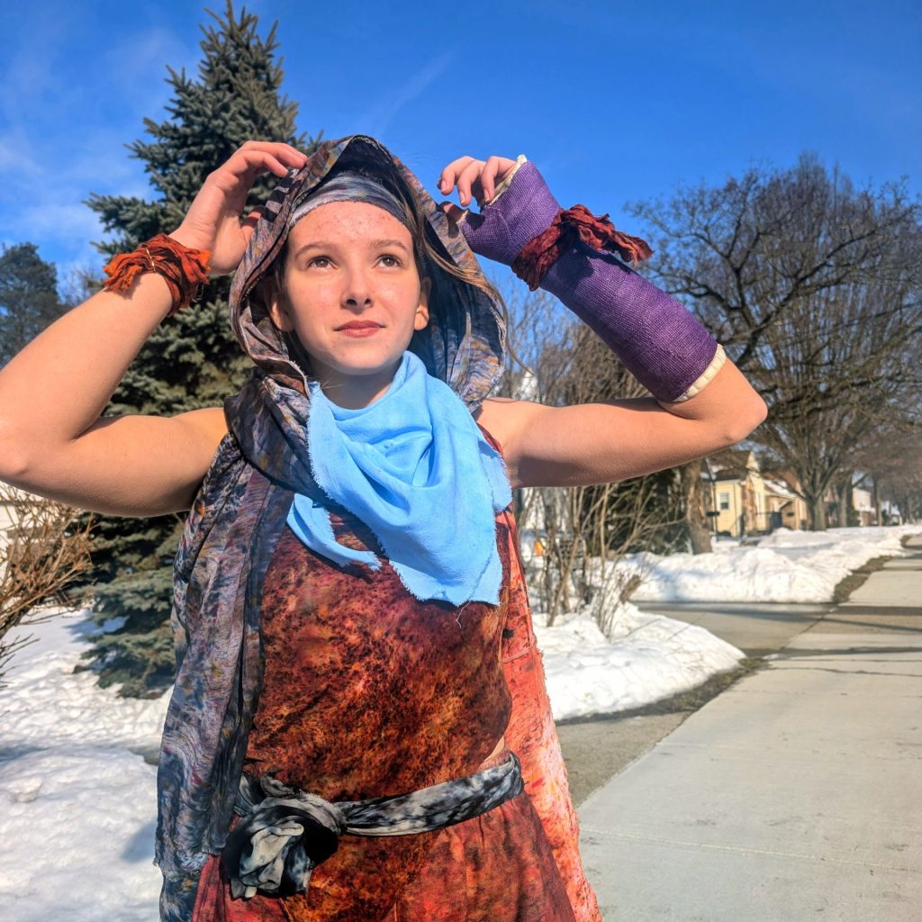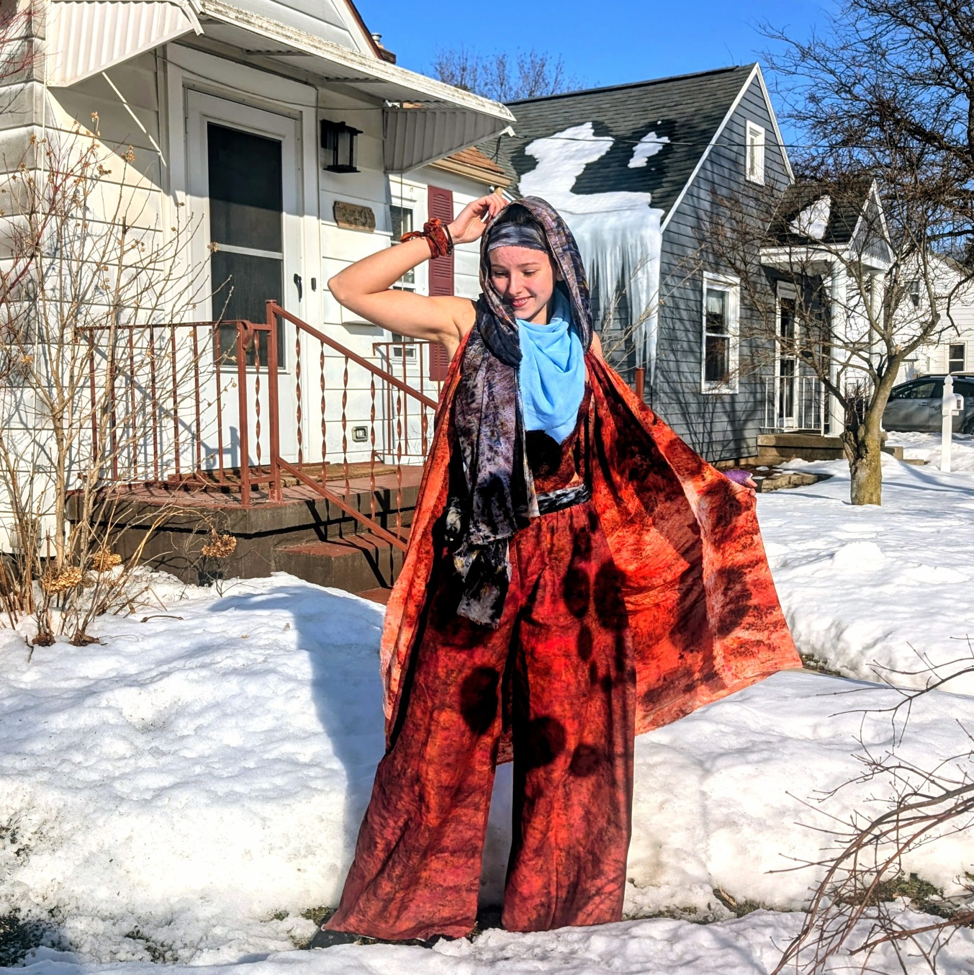 My dry dash-dye method created feather-like pattern breaks across the rayon, giving the layers that broken, organic plumage effect rather than flat color.