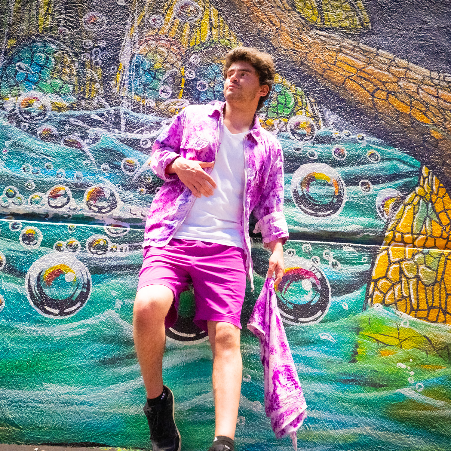 Dustin approached color the same way he approaches motion—with curiosity, restraint, and trust in the process. By removing color first and gently dashing Burgundy back into the fabric, his upcycled pieces began to feel like rhythm made visible.